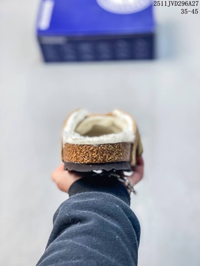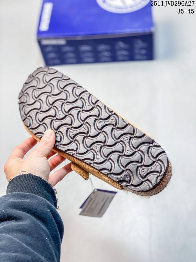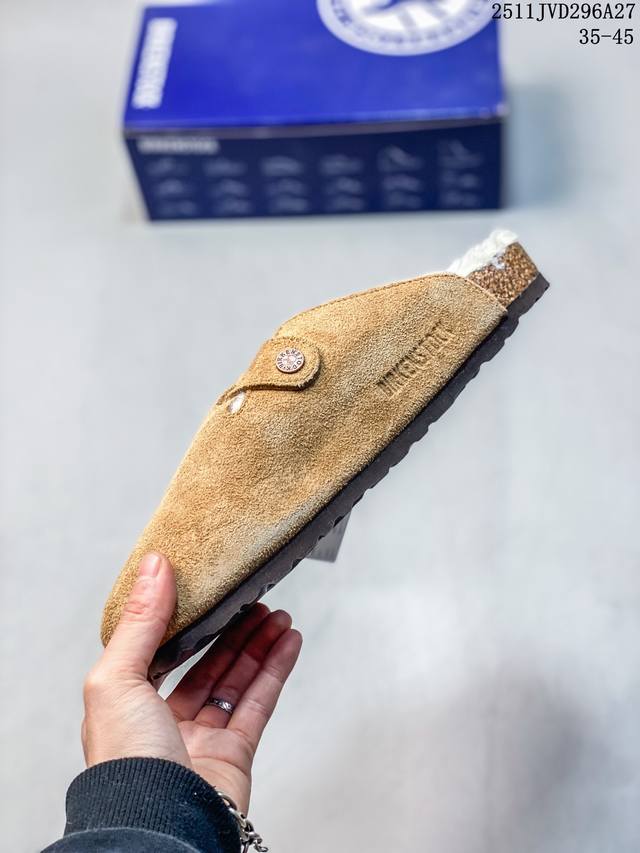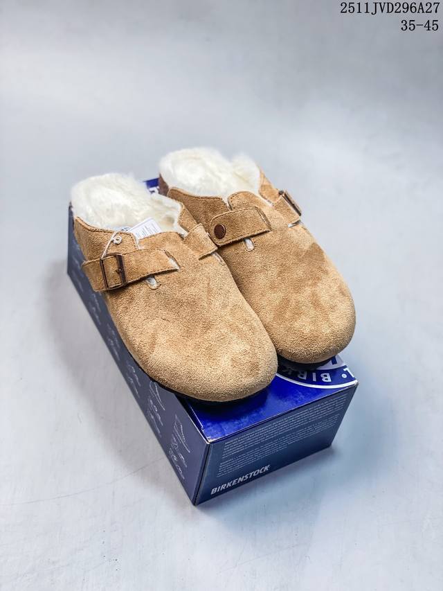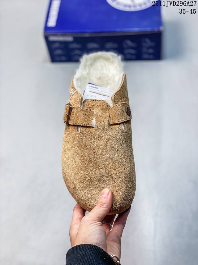Birkenstock Boston Vl Birkenstock Suede Metal Buckle Cork Sole Closed-Toe Slippers. Soft suede leather with adjustable buckles for enhanced comfort. Ergonomic design distributes foot pressure and protects the ankle. Cork latex footbed has some elasticity, conforming to the foot shape after prolonged wear. Eva sole offers high resilience and tensile strength, providing excellent shock absorption and cushioning. Suitable for all seasons. The soft footbed features an additional foam cushioning layer for extra comfort and all-day support. Exclusive online launch. Made with meticulous German craftsmanship. Nubuck upper, pine midsole, Eva three-layer combination, premium leather outsole, hardware buckles. Export order. Sizes: 35-45. Code: 105934. Item Number: 0160371. 11Jvd296A27.