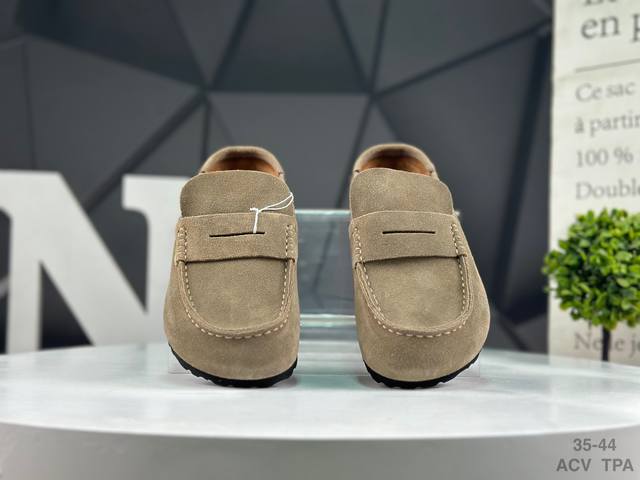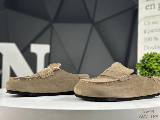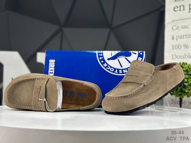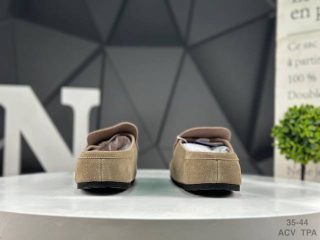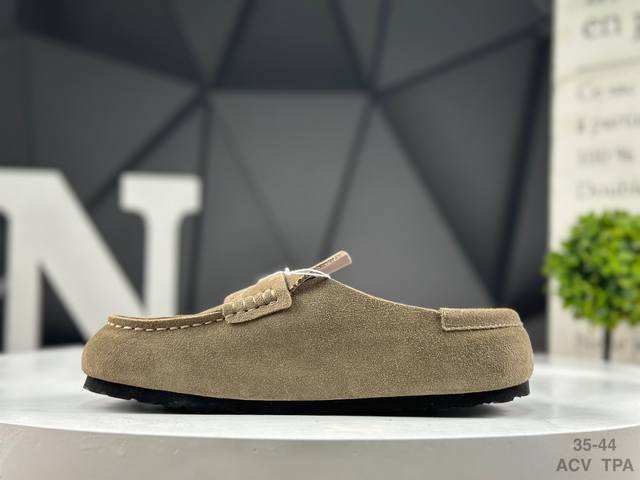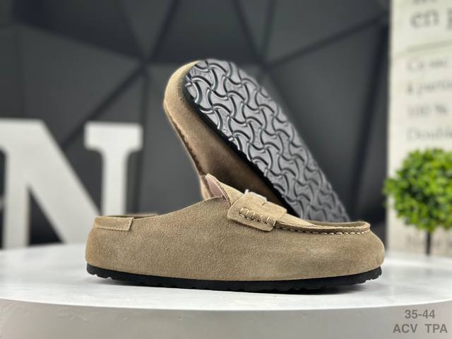 Birkenstock slip-on series brown suede. Made in Guangdong, this shoe features soft cowhide suede with a lambswool insole and lining. Its midsole features a cushioning cork rubber. Its solid wool lining provides warmth and style. Its lightweight EVAP outsole is fitted. This is a new Birkenstock series from the renowned German footwear brand, known for its century-old heritage! Item number: 0 901. Sizes: 35-44. Acv Tpa.