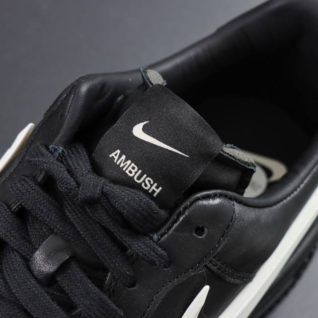 Ljr's original production line. The shoe features a solid-color leather upper and lining, with the iconic oversized Swoosh prominently displayed. The tongue tag also features both logos, and the laces have unique buckle designs. The heel features the same TPU design as the Dunk, along with the Ambush logo, highlighting the collaboration. Style Code: Dv3464-001 Sizes: 36 36.5 37.5 38 38.5 39 40 40.5 41 42 42.5 43 44 44.5 45 46 47.5
