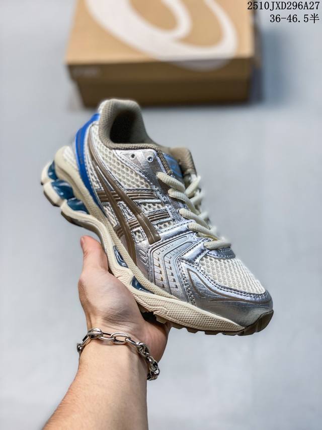 Asics Gel-Kayano 14 was launched in 2008 amidst great anticipation. Designer Hidenori Yamashita was inspired by the word "Flash" to create a futuristic metallic upper, transforming and upgrading the internal performance. It is a complete innovation from the inside out, creating a milestone work for the Gel-Kayano family heritage and the continuation of classic running shoe culture. The Asics Gel Kayano 14 running shoe reinterprets the retro running shape, redesigned with a late 2000s aesthetic. The silver and blue upper exudes a premium feel. Mesh details on the upper and toe enhance breathability. The Asics Gel Kayano 14 features Gel cushioning in the heel midsole and multi-density abrasion-resistant outsole, providing high impact resistance, cushioning, and protection against ground impacts, resulting in exceptional comfort. Get yours now! (