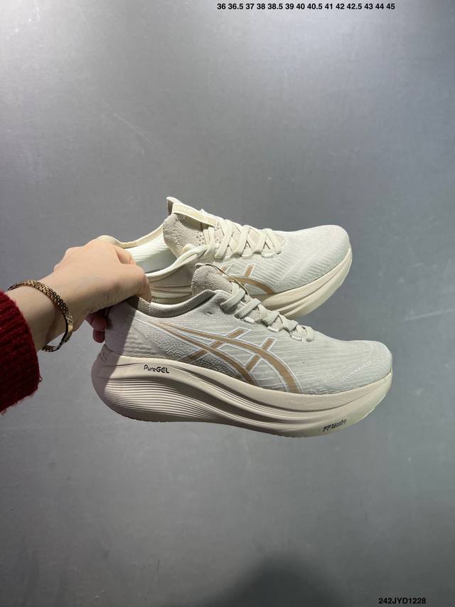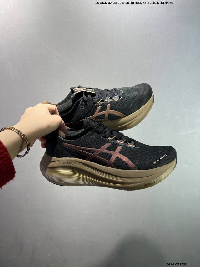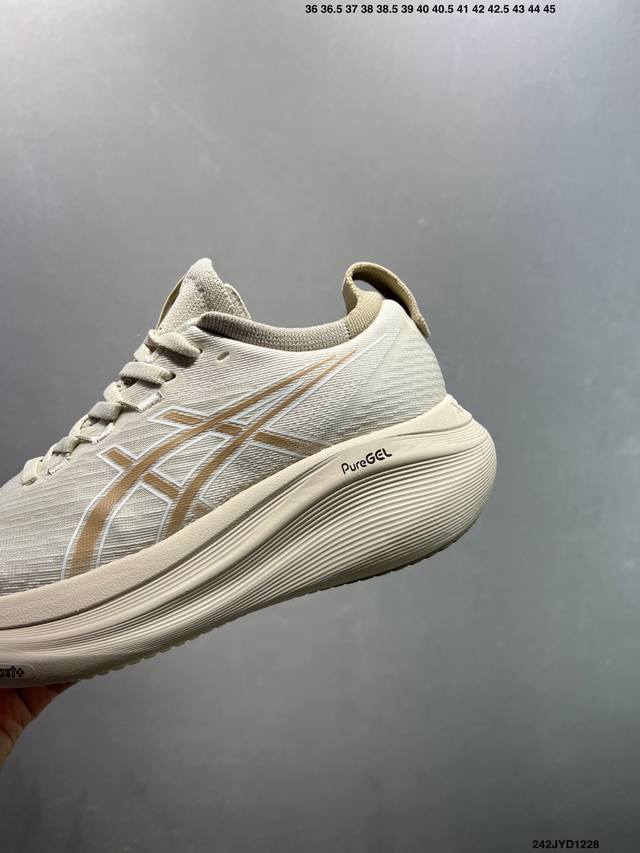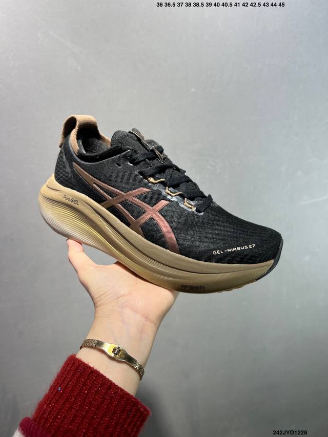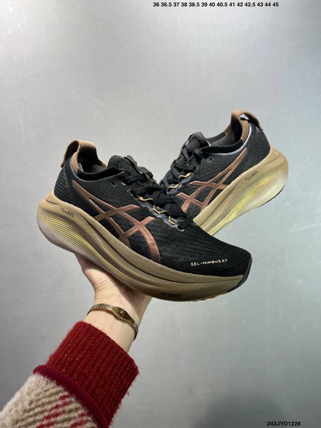 Company-grade Asics Gel-Nimbus 27 stability running shoes. The upper features a double-layer jacquard mesh design for improved fit and breathability. The T-Gel stability system in the heel enhances overall support and structure, reducing impact load on the body. The innovative midsole provides lightweight responsiveness. Product Code: 10118946-400 Sizes: 36 37 37.5 38 39 39.5 40.5 41.5 42 42.5 43.5 44 45 ID: 242Jyd1228