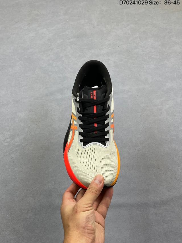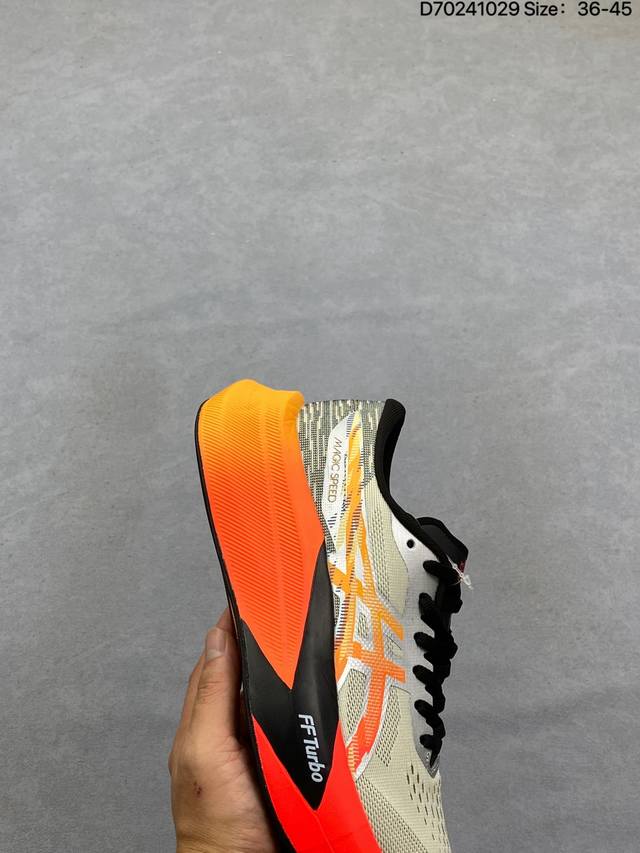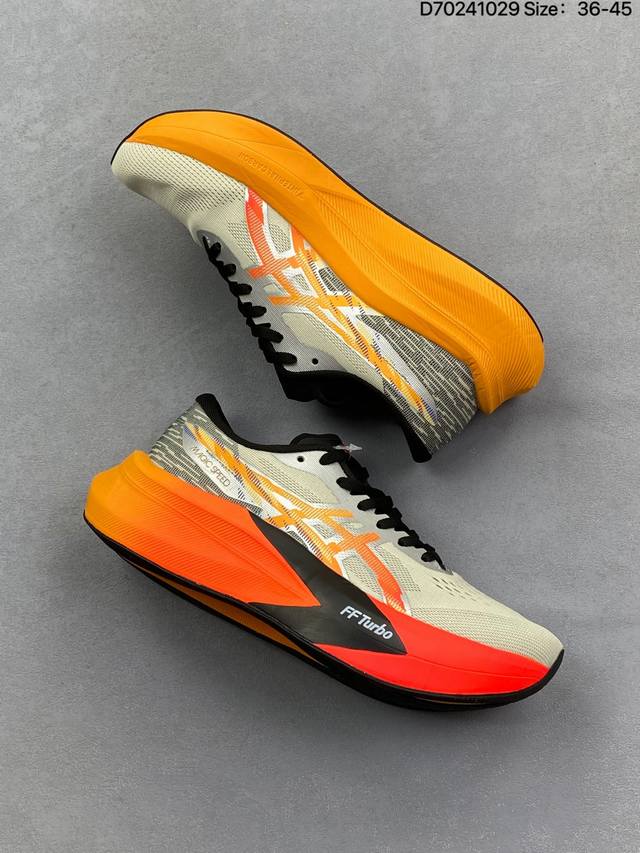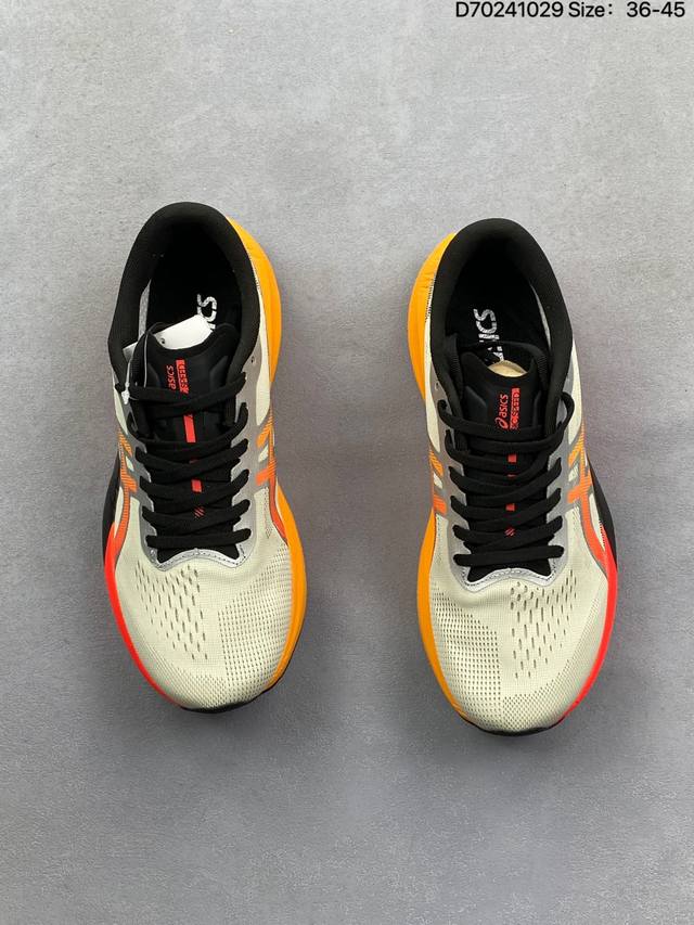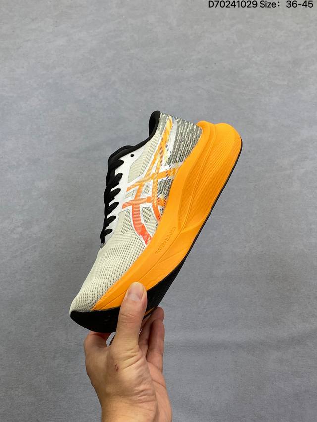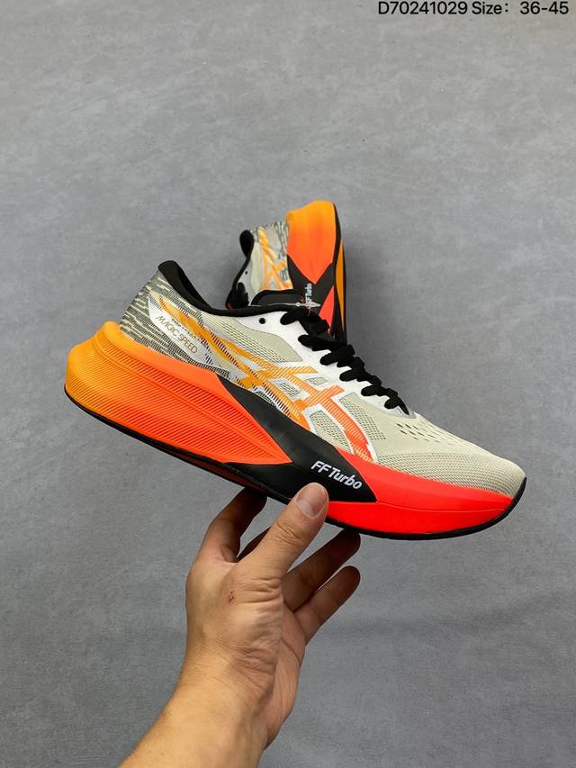 Company-grade Asics Magic Speed 4 stability running shoes. The upper features a double-layer jacquard mesh design for improved support and breathability. The heel incorporates T-Gel stability technology to enhance overall support and structure, reducing impact load on the body. The innovative midsole offers lightweight and responsive cushioning. Product Code: 1011C178-200. Sizes: 36-45. (D70241029)