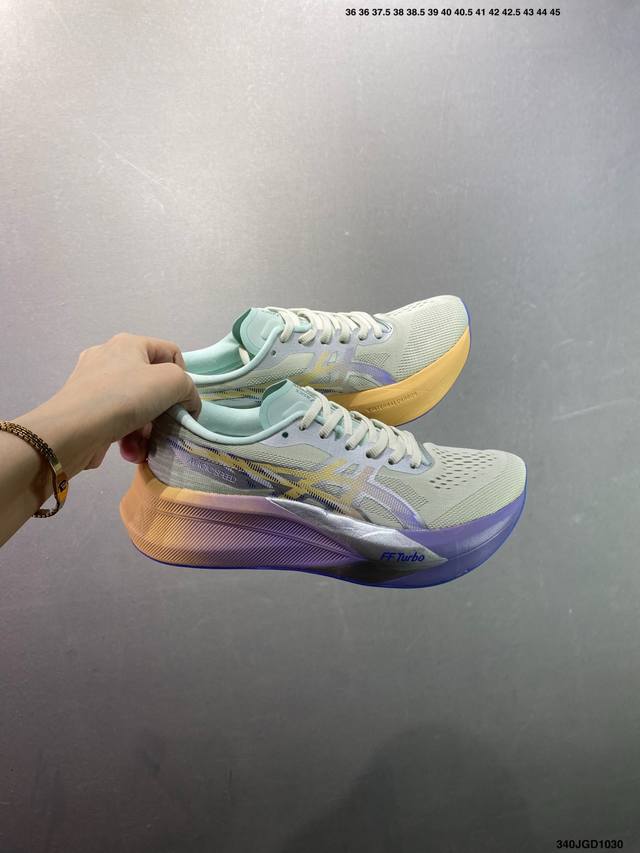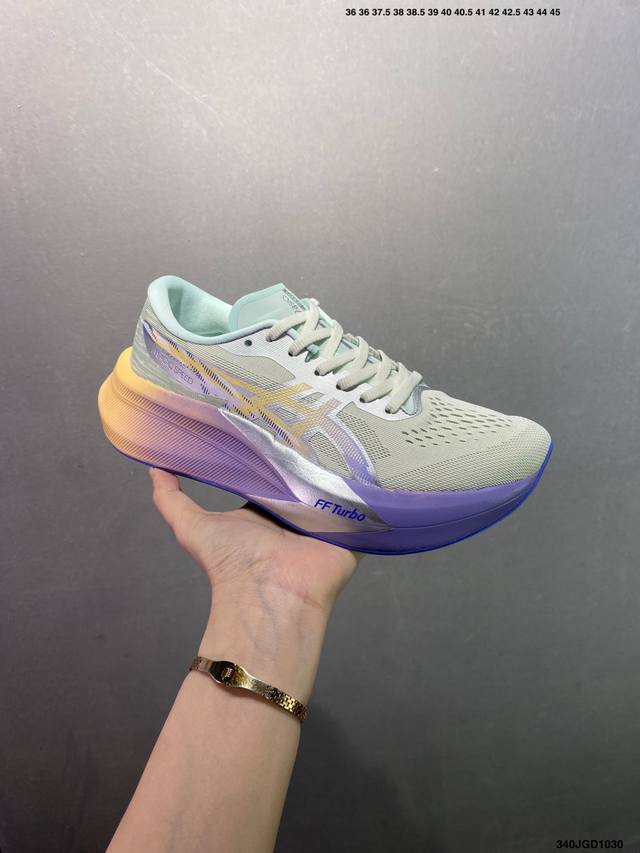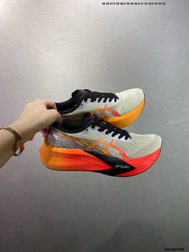 Company-grade Asics Magic Speed 4 stability running shoes. The upper features a double-layer jacquard mesh design for improved support and breathability. The heel incorporates T-Gel stability technology to enhance overall support and structure, reducing impact load on the body. The innovative midsole offers lightweight responsiveness. Product Code: 1011C178-200. Size: As shown. Code: 340Jgd1030.