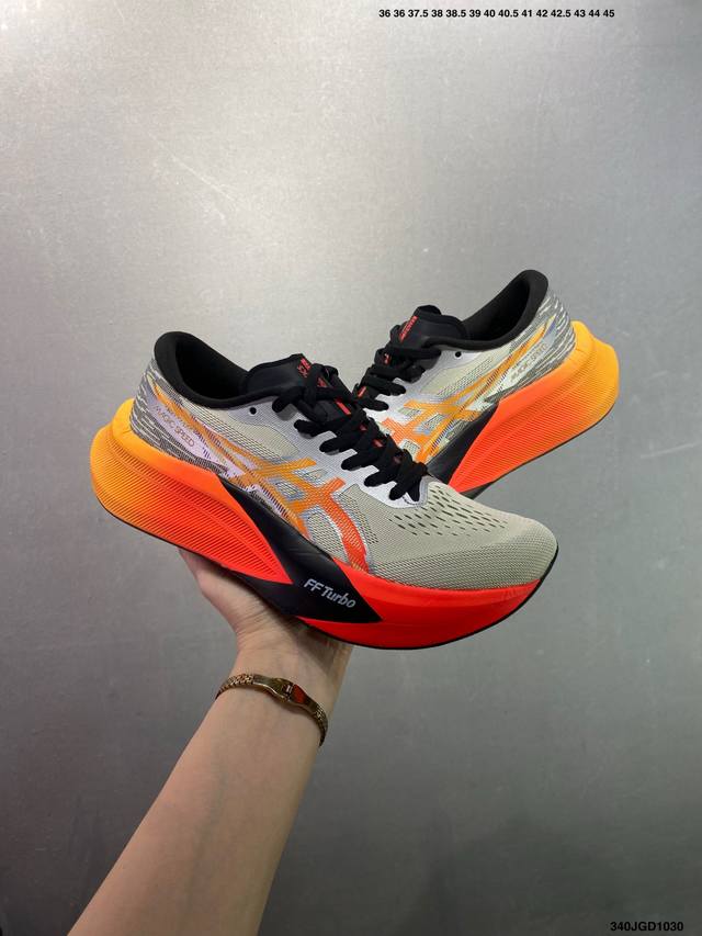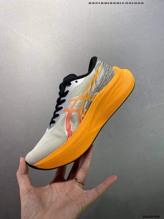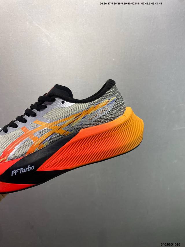 Company-grade Asics Magic Speed 4 stability running shoes. The upper features a double-layer jacquard mesh design for improved support and breathability. The heel incorporates T-Gel stability technology to enhance overall support and structure, reducing impact load on the body. The innovative midsole offers lightweight responsiveness. Product Code: 1011C178-200. Size: As shown. Code: 340Jgd1030.