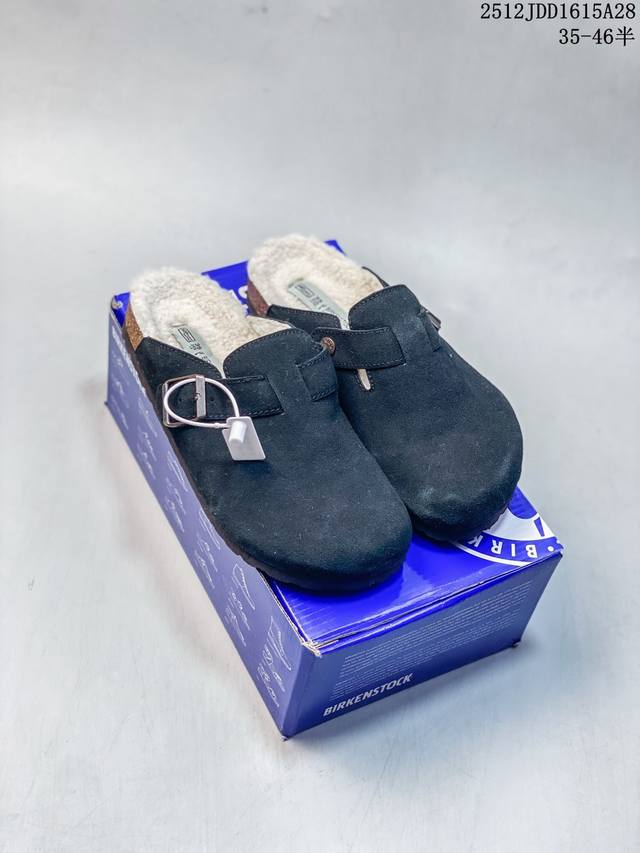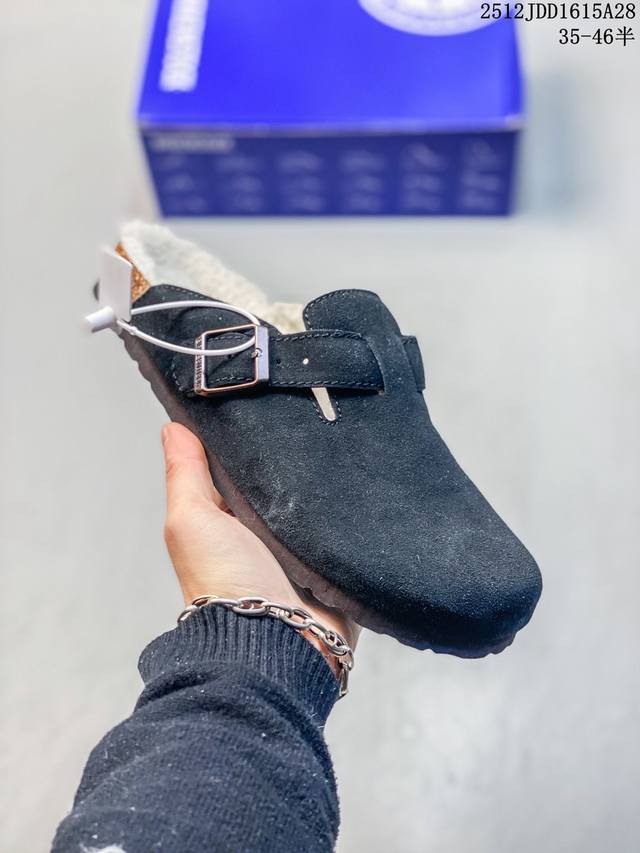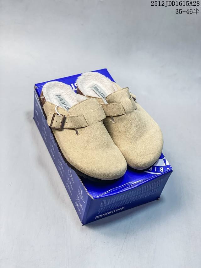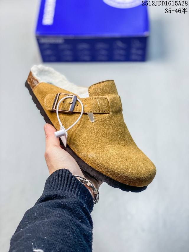 Company-grade Birkenstock Boston Suede Shearling, a Boston series casual home slipper from the century-old German footwear brand Birkenstock. Low-top, suede, vintage cork sole, closed toe, open heel. Features a soft suede lining, shearling upper, and a midsole with a wave-shaped cushioned cork rubber sole. Outsole: Lightweight EVA sheet material. Item No.: 0560773 Sizes: 35-45 Code: Uiwb1112Znl 12Jdd1615A28