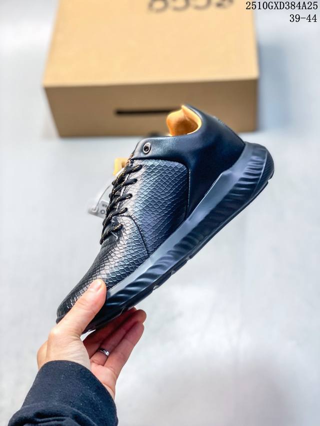 Company-grade Ecco shoes, a popular style on Xiaohongshu (Little Red Book), new versatile casual Ecco men's outdoor casual shoes, breathable, lightweight, lace-up, comfortable dad sneakers. Ecco is one of the world's four major casual footwear brands, headquartered in Denmark. Its shoes are characterized by their lightweight, soft and flexible materials, and comfortable wear. This Ecco shoe features a full leather upper, with an overall high-end, stylish, simple, and elegant design, and is non-slip and comfortable. Type: Men's shoes Sizes: 39-44 Example: 10Gxd384A25