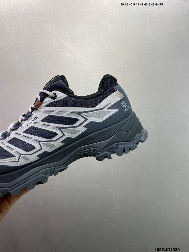 Company-grade Kailas Fuga Du Boa Light Off-Road Hiking Shoes with Mesh TPU Shock Absorption, Anti-Slip, Breathable, Supportive, Rebound, Low-top, Super Grip Hiking Shoes. The Du Boa Fitting System allows for quick and precise micro-adjustment via a knob. The Vibram Megagrip Litebase Outsole features a 125mm ultra-wide forefoot for superior grip, easily handling steep slopes, slippery surfaces, and other complex mountain terrain. The dual-density high-rebound midsole releases powerful performance. The forefoot features a supercritical physical foam elastomer, 7% thicker, increasing rebound by 27%. The stable and balanced peripheral support elastomer material enhances forefoot stability. The TPU exoskeleton joint stability system provides rock-solid support for a more stable landing. Sizes: 39, 39.5, 40, 41, 41.5, 42, 42.5, 43, 44, 44.5, 45, 46. ID: 168Gjd1030