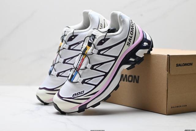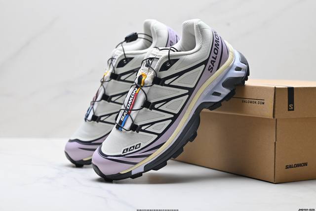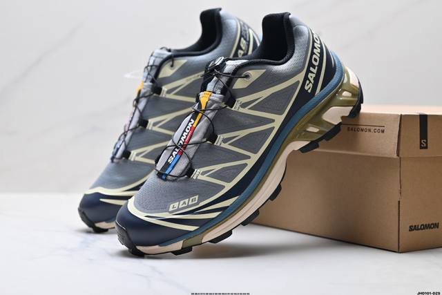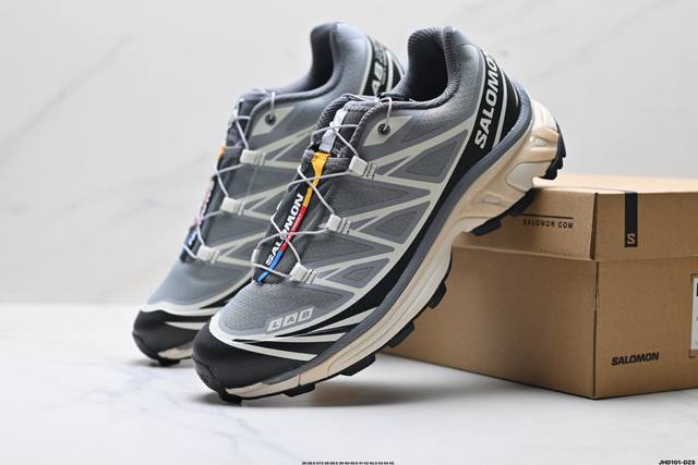 Company-grade Salomon XT-6 outdoor trail running shoes. The upper features Sensifit fit technology for a full-body wrap around the foot. The heel and outsole traction design provide strong grip, making them more suitable for rugged terrain. The lightweight 3D Advanced Chassis chassis material and maximized spike design offer enhanced stability and protection. The outsole uses Contagrip high-abrasion-resistant material in high-wear areas to withstand the challenges of long-distance running on hard urban surfaces. Product No.: 478640-26 ID: Jhd101-Dzs