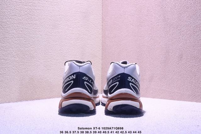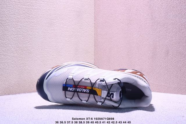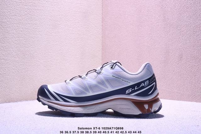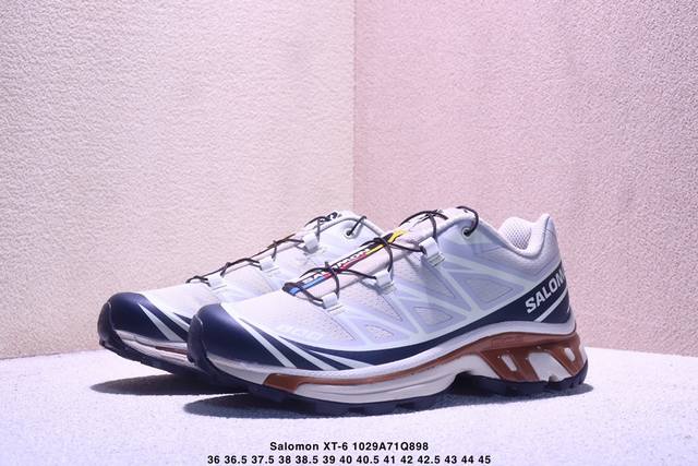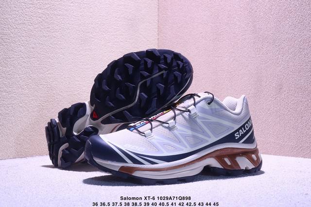 Company-grade Salomon XT-6 outdoor trail running shoes. The upper features Sensifit fit technology for a full-body wrap around the foot. The heel and outsole traction design provide strong grip, making them more suitable for rough terrain. The lightweight 3D Advanced Chassis chassis material and maximized lug design offer enhanced stability and protection. The outsole uses Contagrip high-abrasion-resistant material in high-wear areas to withstand the challenges of long-distance running on hard urban surfaces.