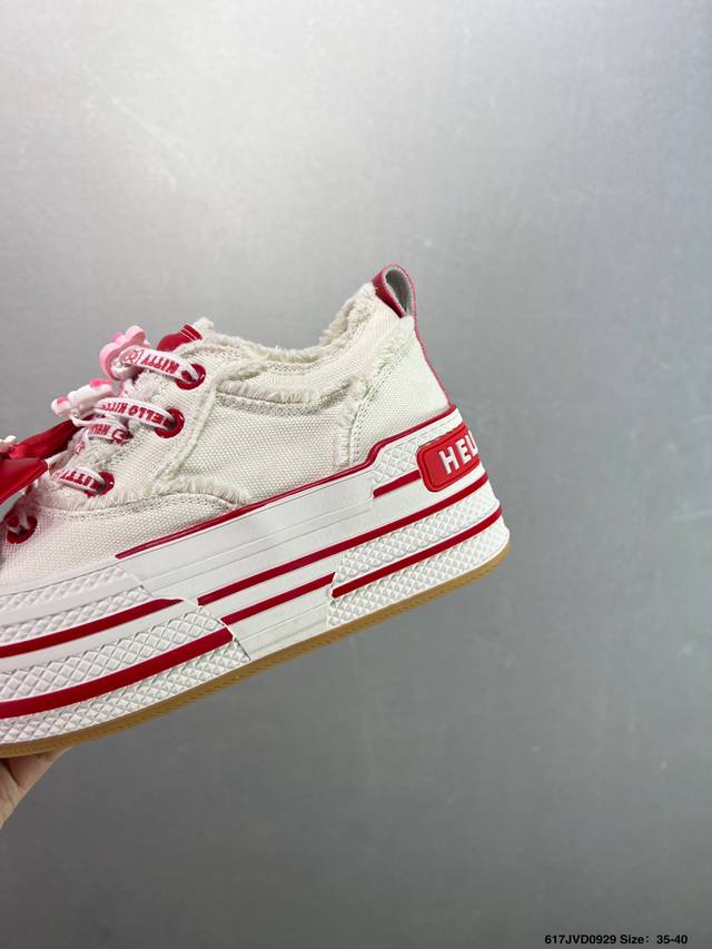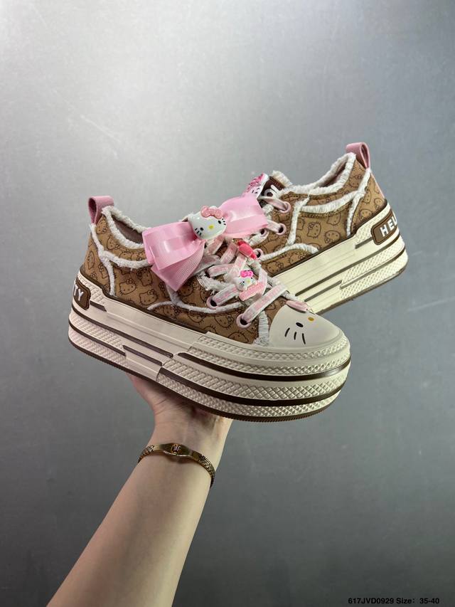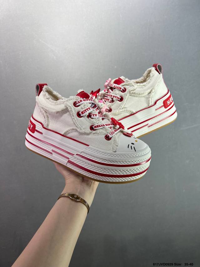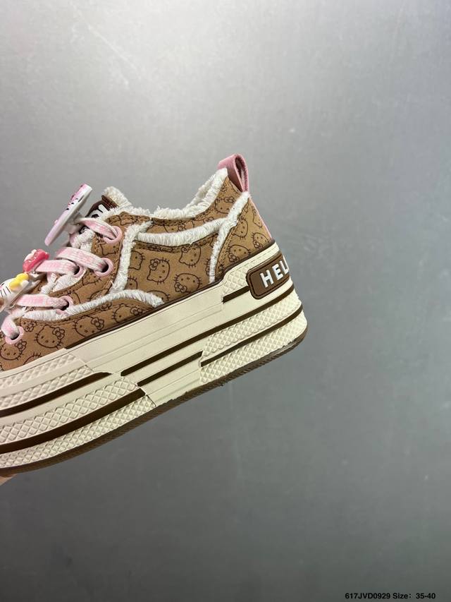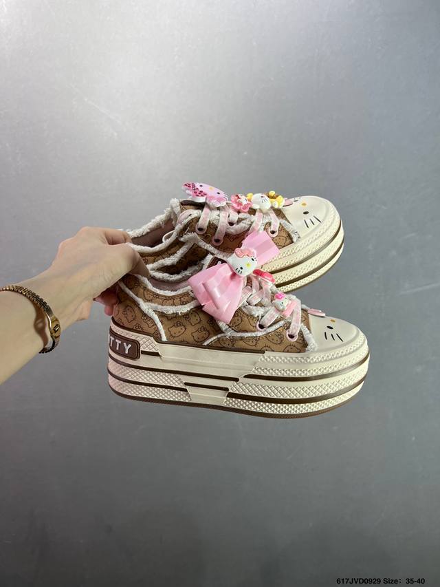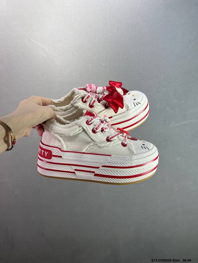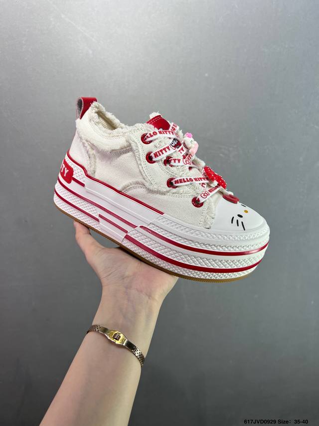 Company-grade Sanrio X Old Order limited edition Hello Kitty pastel blue macaron platform height-enhancing canvas shoes. The all-over Hello Kitty print is truly adorable. The pastel blue frayed edges give it a Chanel vibe. They're comfortable and comfortable, with a fresh and clean look. Even petites can look long-legged when out and about. These shoes are sure to turn heads and create a stylish look, perfect for everyday wear. Sizes: 35-40. Code: 617Jvd0929.