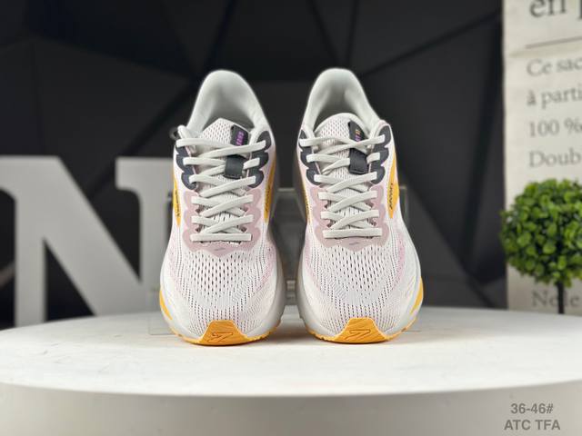 Max cushioning. Equipped with a Dna Loft V3 nitrogen supercritical foam midsole, the midsole boasts a 26mm forefoot and a 36mm heel, with a 10mm drop for a soft and bouncy balance. Nitrogen injection creates a closed airbag structure, improving cushioning by 30% and energy return by 10% compared to the previous generation. Tests show that the shoe absorbs 68% of the impact force at heel strike on an 80kg runner, while rebound speed during forefoot extension is increased by 15%. Made from a double-layer jacquard engineered mesh, the outer layer features high-density breathable mesh for rapid perspiration removal, while the inner layer features an elastic support frame for enhanced support. A 5mm wider forefoot and a thickened memory foam tongue ensure a seamless fit for runners with wide feet. The 3D molded foam in the heel and the TPU stabilizer form a double-locking structure, ensuring reliable stability in complex road conditions. Suitable for 5-6 km/h jogging paces, it balances cushioning and propulsion. The outsole contains 30% recycled polyester fiber, and the upper is made of bio-based materials. Available in standard and wide lasts to meet the needs of different foot shapes. Featuring "all-around cushioning" properties, it is suitable for daily training and long-distance jogging. Item No.: 120431 1D 070 Size: 36-46 Atc