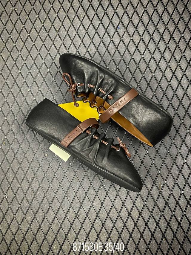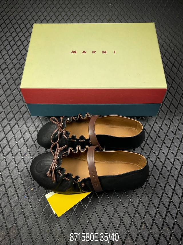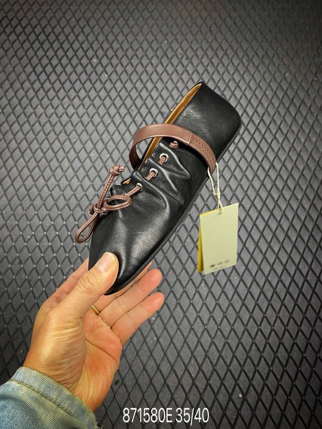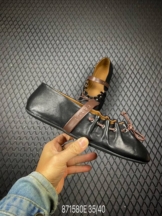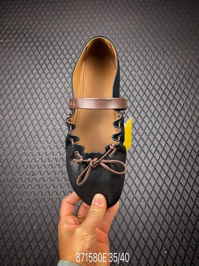 DDD 2026 Spring/Summer New Marni 26Fw Ruffled Bow Ballet Flat Mary Jane Shoes DDD Round toe silhouette, contrasting upper, brown bow and lace-up collar, presenting an overall cute and minimalist style. DDD Super cute Marni ballet flats, the color blocking and relaxed lace-up are just the right balance of sweet and cool. DDD The romantic season of Balletcore is here again. Open your shoe cabinet, and ballet flats are definitely the item that can match everything and brighten up everything! Upper: Calfskin DDD Insole: Sheepskin DDD Outsole: Molded rubber outsole DDD Sizes: 35 36 37 38 39 40 DDD Code: 871580E DDD