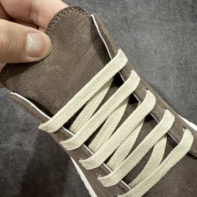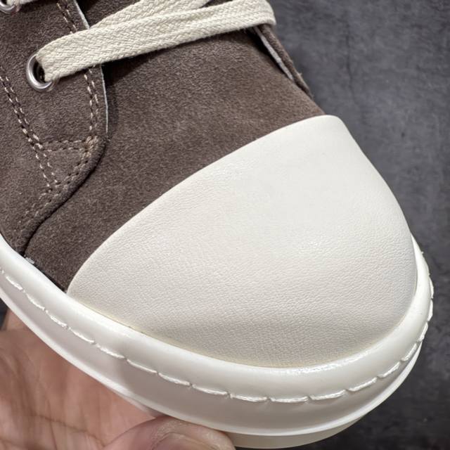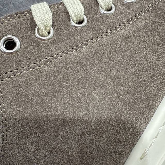 Dongguan-made G-version Mocha Brown Low-top Converse Rick Owens, classic low-top Converse with suede sole and a watermelon toe design. Made in Dongguan, brand new 2025 material: high-gloss suede. The shoelaces are woven using a water-dyeing process, resulting in a high-density, lustrous finish. The toe box is soft and smooth, with a fine, textured feel when gently pressed. The tongue lining is also made of full-grain cowhide, cut from a single piece without any patchwork or scraps. The TPU outsole has a milky scent and excellent hardness and feel. The logo on the outsole is clearly and correctly stamped. The insole is made of a single piece of cowhide with three layers of foam inserts in white and pink, featuring exclusive custom-molded perforations. Sizes: 36 37 38 39 40 41 42 43 44 45 46 DDD Encoding: Std480 DDD