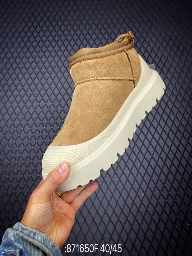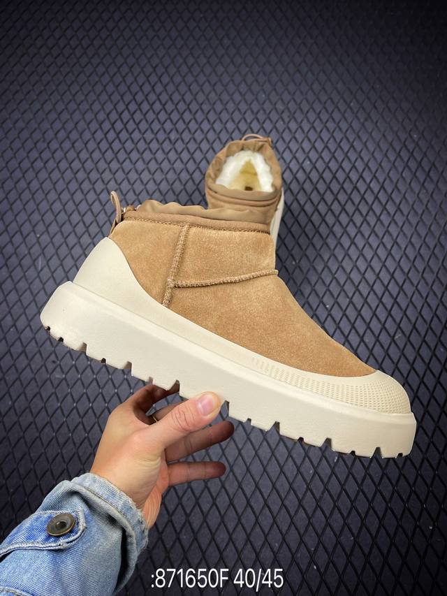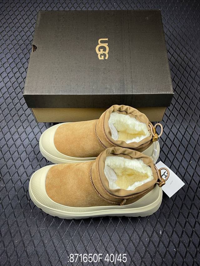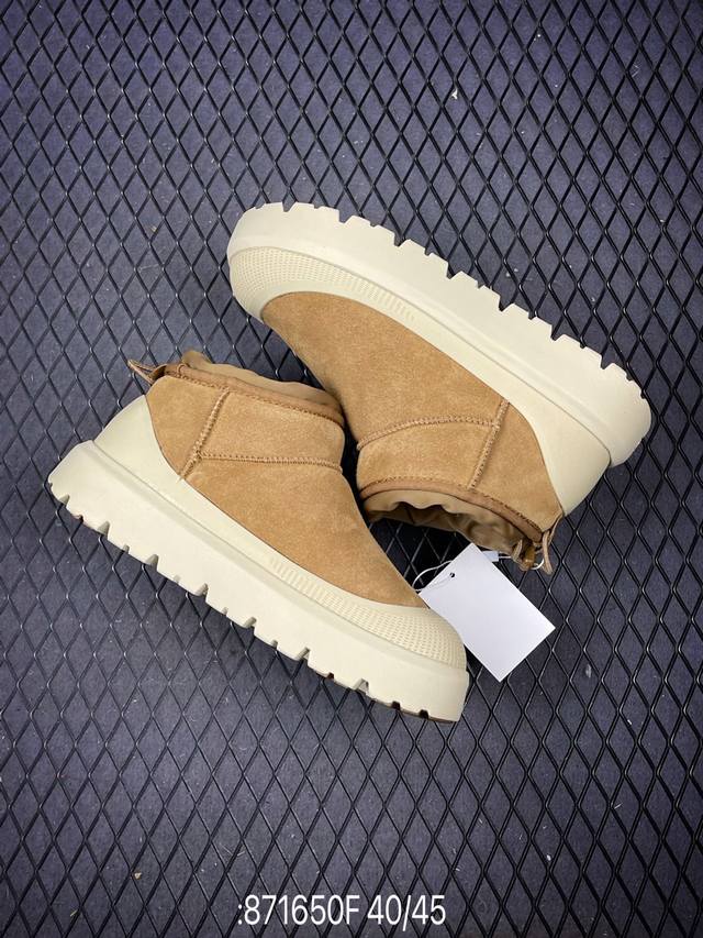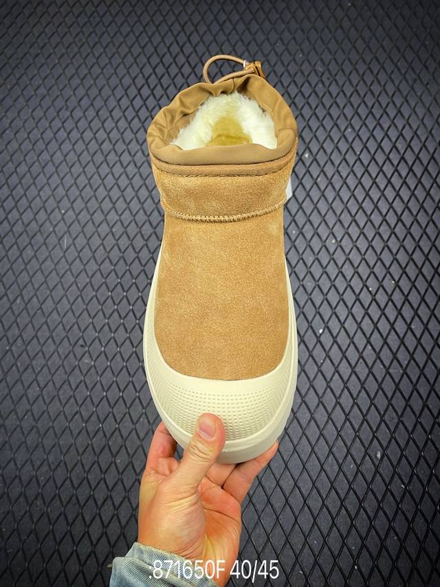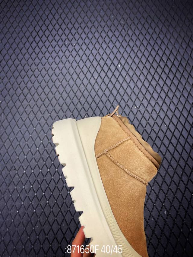 F Top-tier version on the market: Ugg 2025 Wang Yibo second generation series black 4cm thick sole. Produced by a large Guangzhou foreign trade factory. Genuine sheepskin from toe to insole, individually packaged in a box with a waterproof chip, distinguishing it from any other version on the market. Independently developed original design. Cashmere insole for winter warmth, suitable for both outdoor and home wear. In recent years, Ugg has launched a series of styles that cater to younger consumers, moving to the forefront of fashion trends. Shoe material: water-repellent coated suede upper, 17mm Uggpure embedded wool insole, lightweight, non-slip, comfortable rubber outsole with brand logo. Comes with full packaging. Sizes: 40 41 42 43 44 45. Code: 871650F.