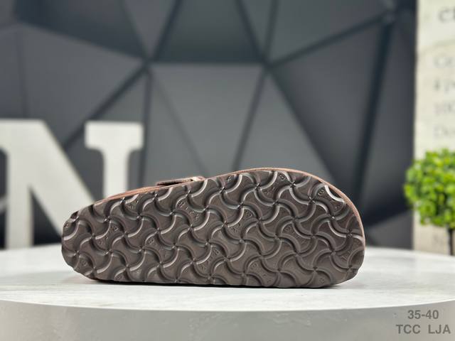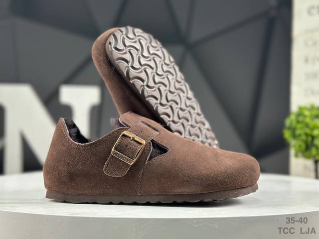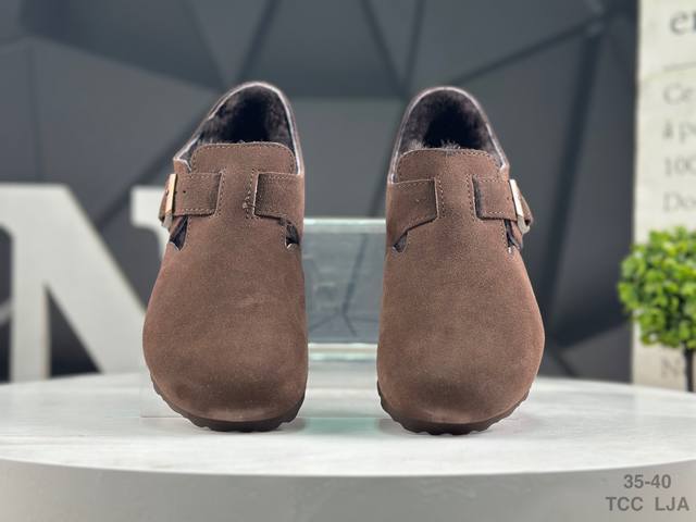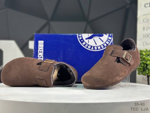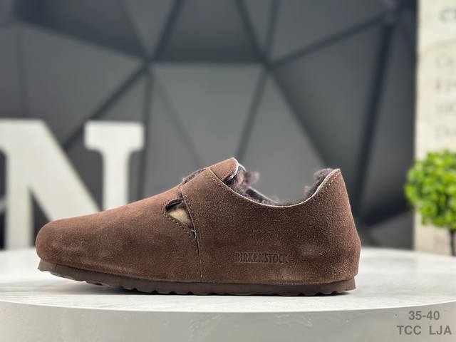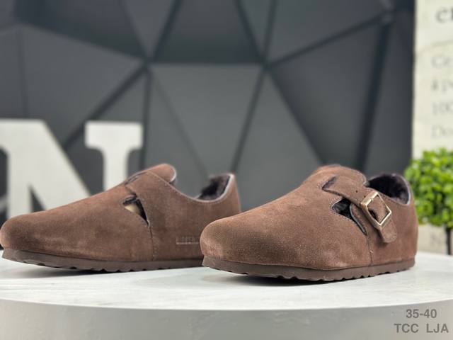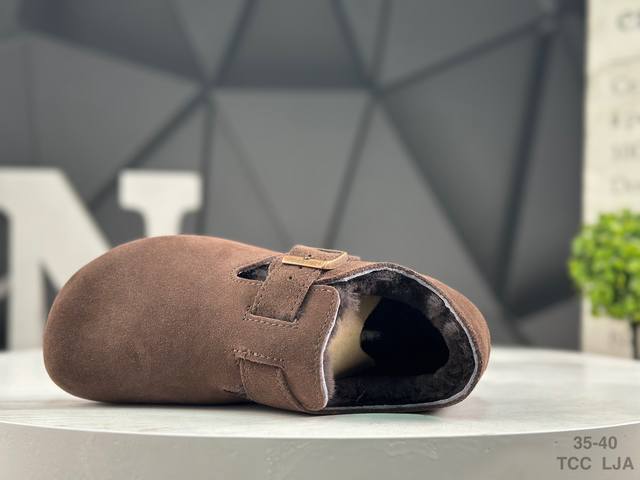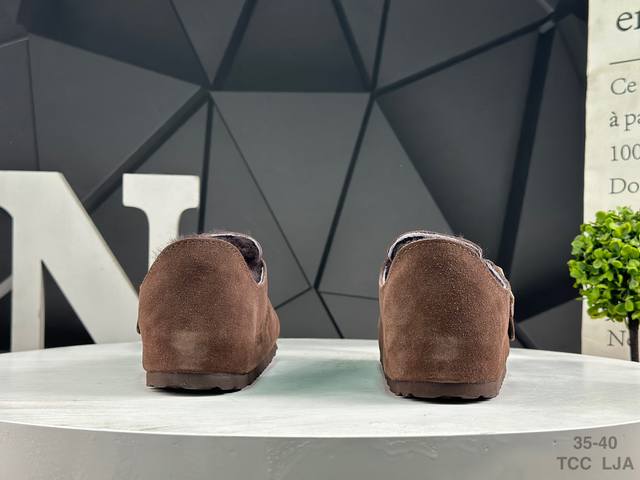 Fleece-lined Birkenstock, a century-old German footwear brand, presents its new Autumn/Winter slip-on sandals. Made in Guangdong. Features soft cowhide leather, cushioned cork rubber midsole, and a lightweight EVA outsole. Sizes: As shown in the picture.