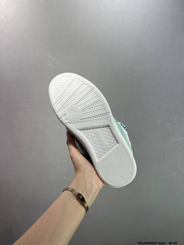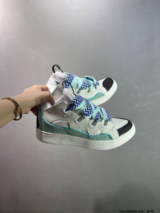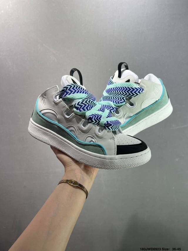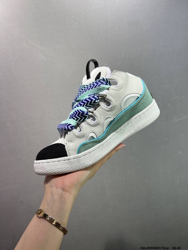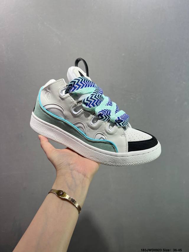 Lanvin recommends the Curb sneakers. Their ingenious design pays homage to skateboarding culture while adding a playful touch, adding a unique streetwear touch to everyday looks. Bruno Sialelli has unveiled a new '90s-inspired sneaker, showcasing both refined design and bold styling. This intricately designed patchwork sneaker is crafted from nappa calfskin, suede, and mesh. Its rounded shape, padded tongue, and curved metal eyelets ensure exceptional comfort.