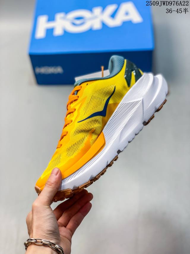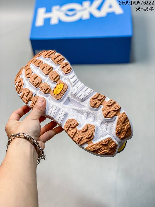 The Hoka Mafate X continues the series' iconic thick-soled Monster DNA. Its cushioning midsole boasts a 49mm heel drop and a 41mm forefoot drop. It retains the professional silhouette of a trail runner while reimagining the trend with minimalist lines. The upper features a three-dimensional, wrapped woven mesh with a dynamic support system, creating a lightweight, breathable, and functional feel. TPU reinforcements in the heel and a pizza-edge Vibram Megagrip rubber outsole create a playful and playful aesthetic amidst its hardcore performance.