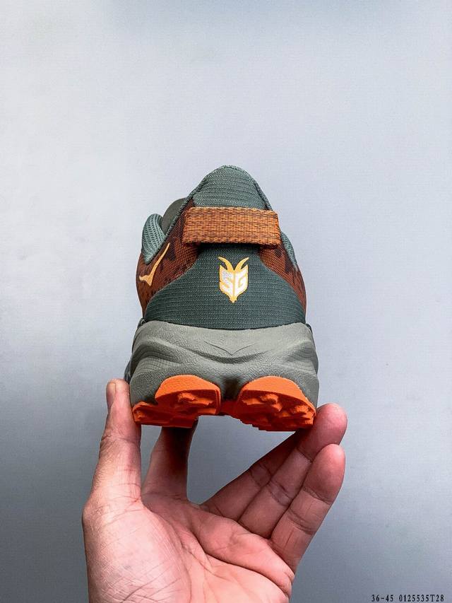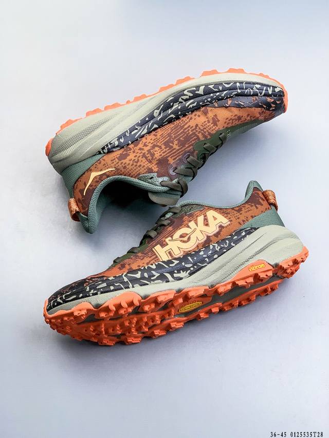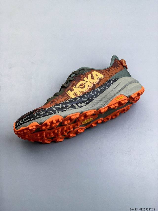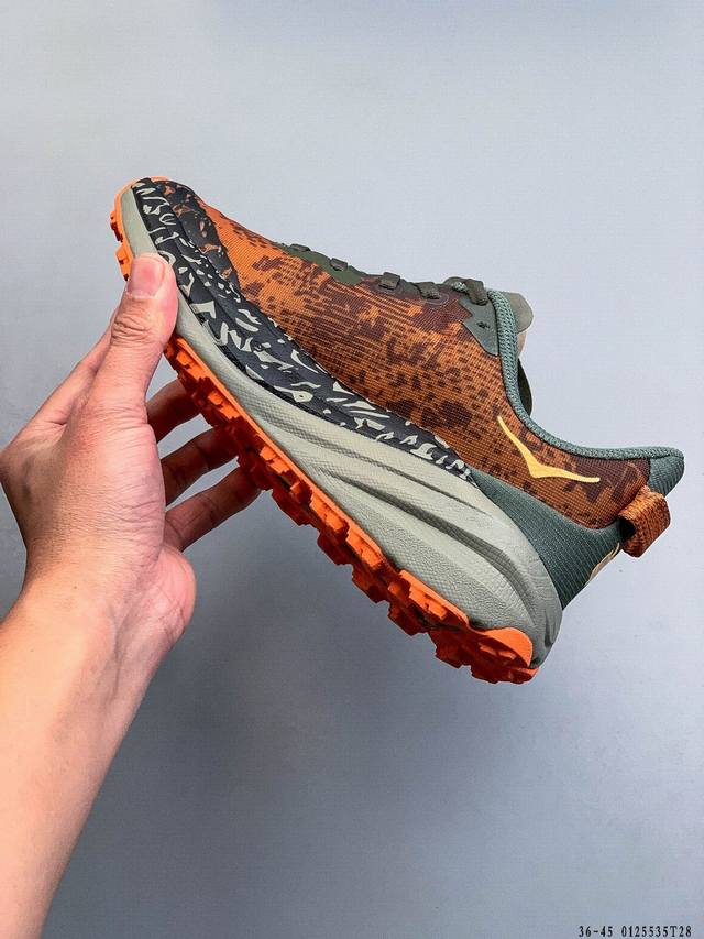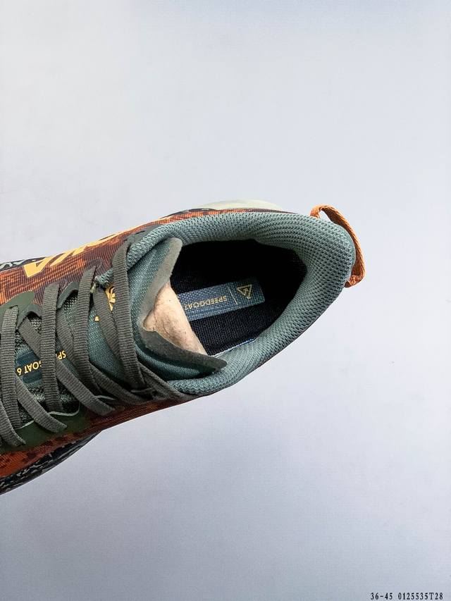 Hoka One One Speedgoat 6 Outdoor Trail Running Shoes. The new generation engineered mesh upper ensures stability while reducing the use of adhesive strips, making the upper lighter, more breathable, and comfortable. Recyclable materials contribute to environmental protection. Extended heel pull tabs facilitate quick and easy on and off. Speed-based rolling balance technology provides a smooth and stable stride on rough terrain . (DDD 0125535T28 DDD)