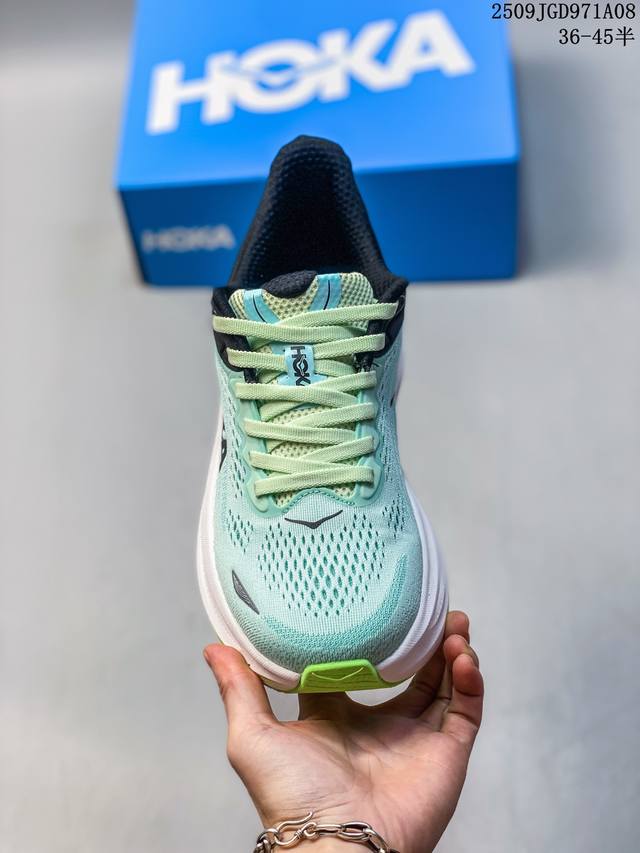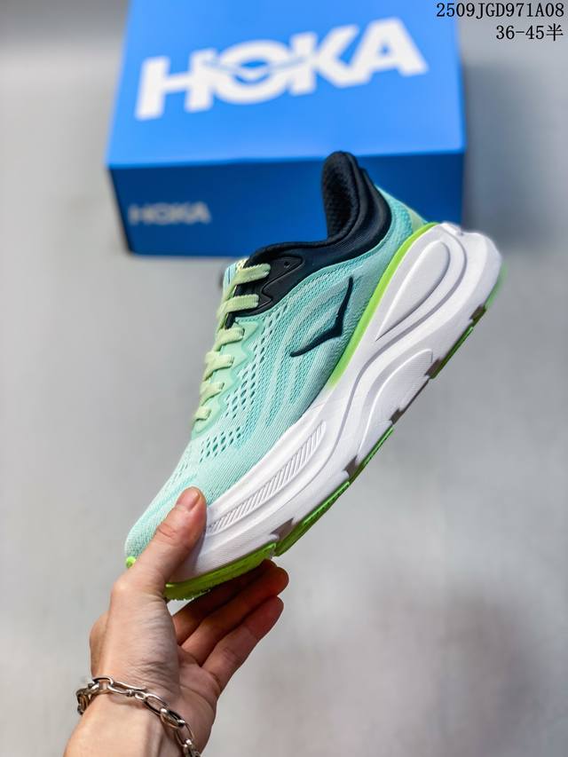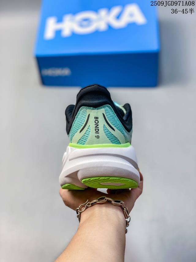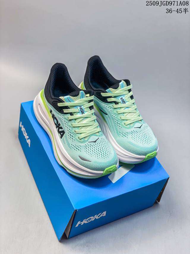 Hoka's One One Bondi 9 is a comfortable, versatile, durable, and lightweight low-top running shoe for men and women. The most notable change in the Bondi 9 is its sole unit. The already solid and reliable sole has been made even thicker, reaching a thickness described as "almost gigantic," making it an excellent choice for those who favor ultra-thick construction. At Hoka's new season showcase, the Bondi 9 debuted a completely redesigned design, boasting not only an upgraded look but also, according to official claims, a significant performance improvement. In terms of weight, for a US men's size 10, it's nearly an ounce lighter than its predecessor, achieving a breakthrough in weight reduction. This shoe features Hoka's maximum cushioning midsole, adding two millimeters to the sole and incorporating Supercritical Foam