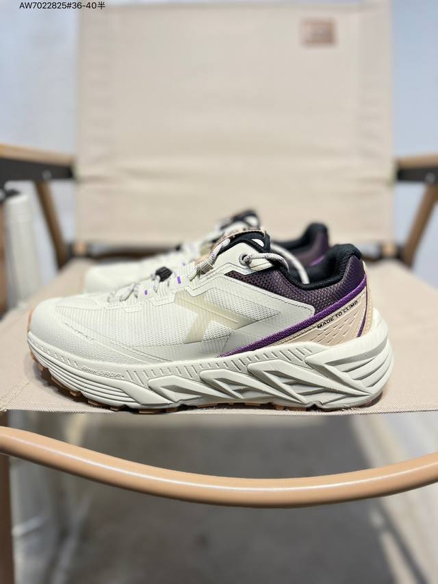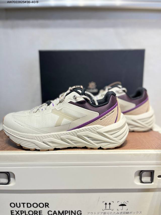 Boa Fit system allows for quick fine-tuning and precise fit via a dial. Vibram Megagrip Litebase outsole with a 125mm ultra-wide forefoot provides superior grip, easily navigating steep slopes, slippery roads, and other complex mountain conditions.