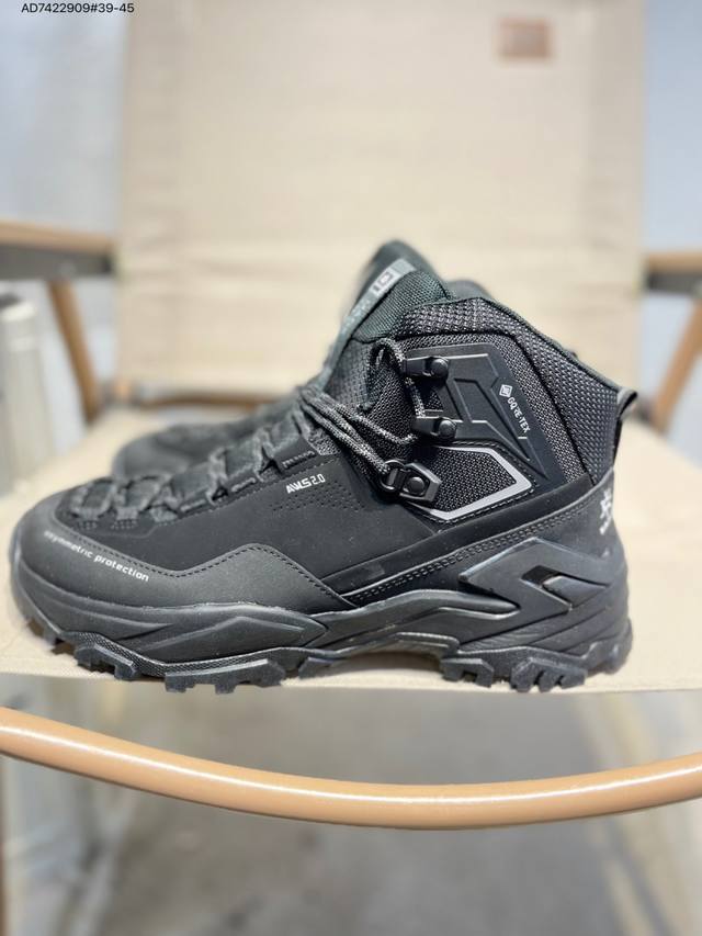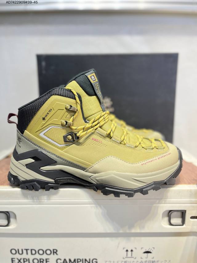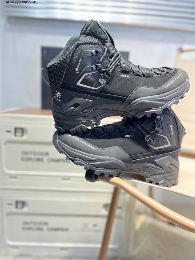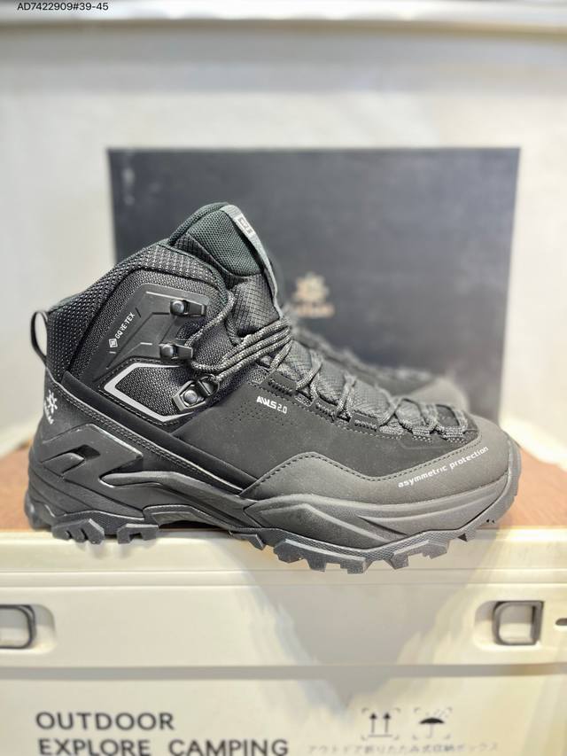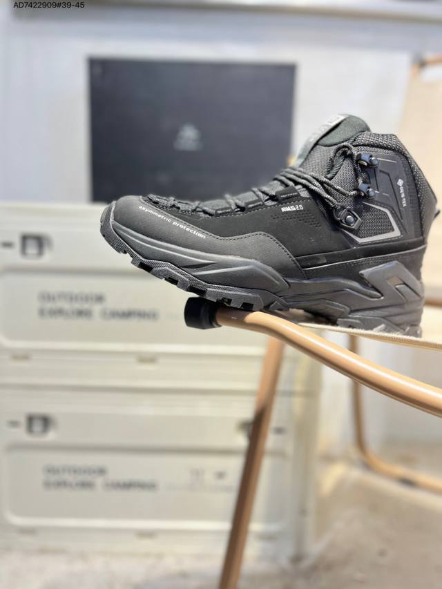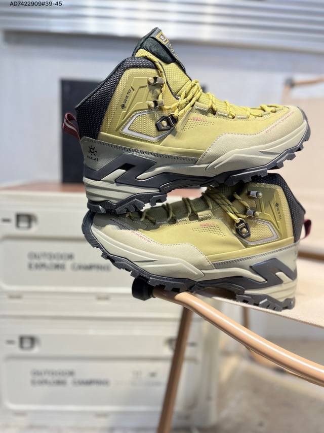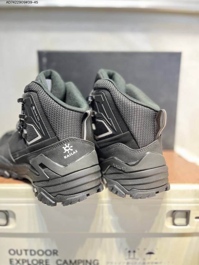 Kailas Jieshan Outdoor High-Top Waterproof Hiking Shoes, produced by a major manufacturer. The upper features Gore-Tex full-sock waterproof technology. The lacing system uses a Boa dial for quick on and off. The Eco-Sport lightweight midsole reduces weight without sacrificing support. A 3D stability system provides strong torsional resistance and protection. The Ddd Vibram outsole with a biomimetic serrated design offers slip resistance and durability. 20251201 Ad7422909#39-45 DDD