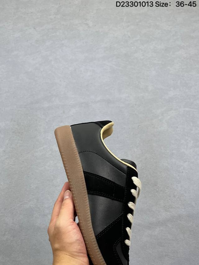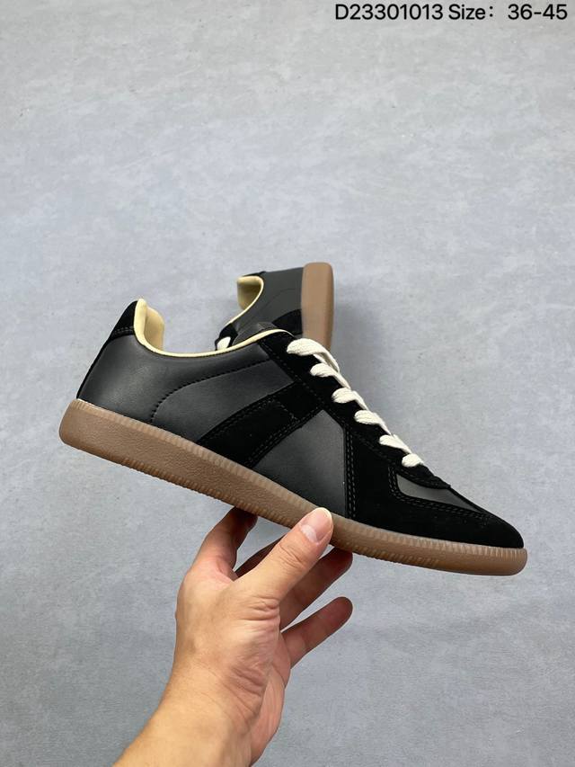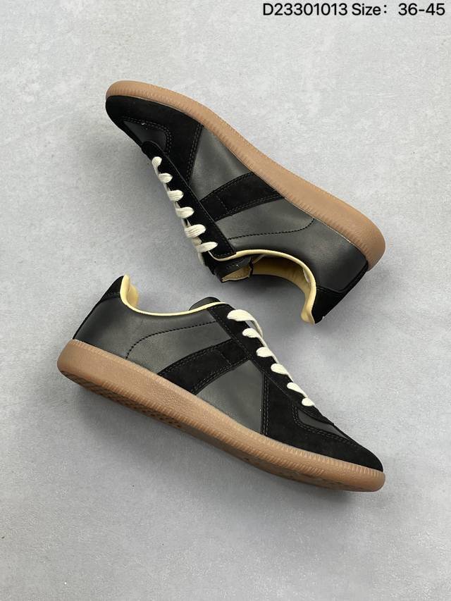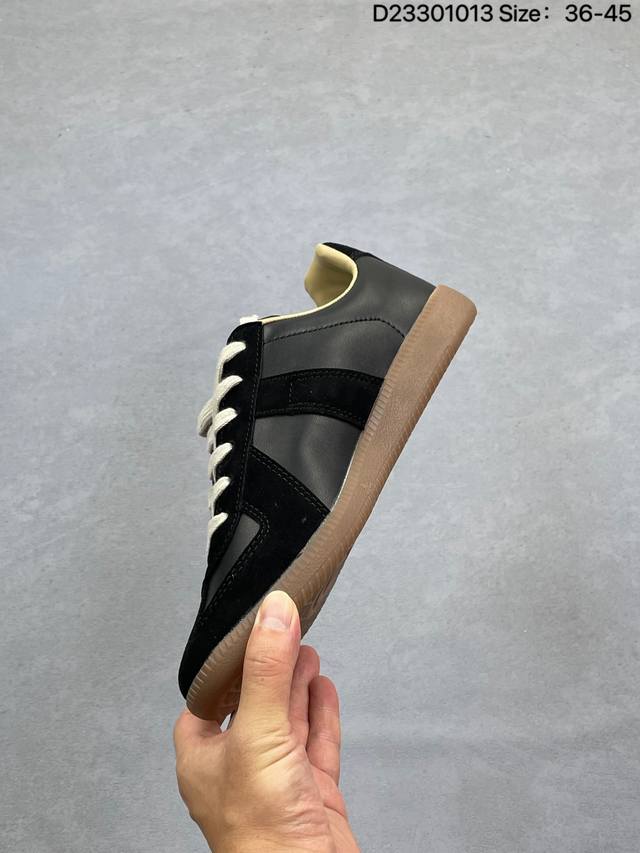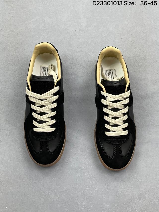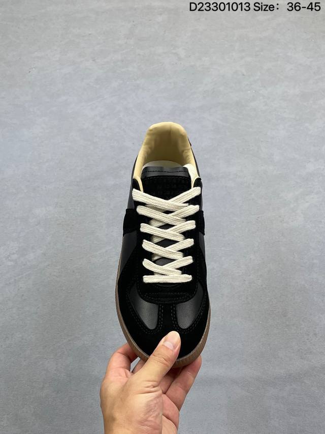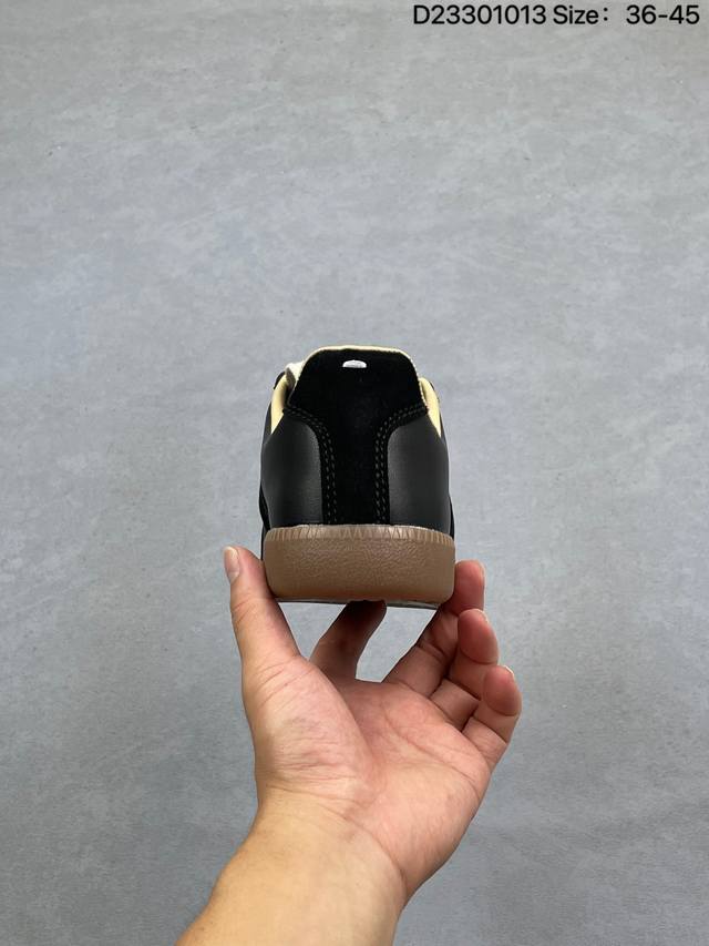 Maison Martin Margiela shoes feature a combination of top-grain calfskin and suede uppers. The inner lining is made of genuine calfskin with PU latex cushioning. The calfskin tongue is made of memory foam and fits the instep. The lightweight, resilient, high-elasticity, durable rubber outsole is a global sensation, popular on Mm6. This is the Maison Margiela 22 Classic Replica Leather Low Sneaker series from the renowned Belgian designer brand Maison Margiela. It's a classic low-top, classic gentleman's style, flat, versatile white sneaker with a black caramel sole. (S57Ws0236