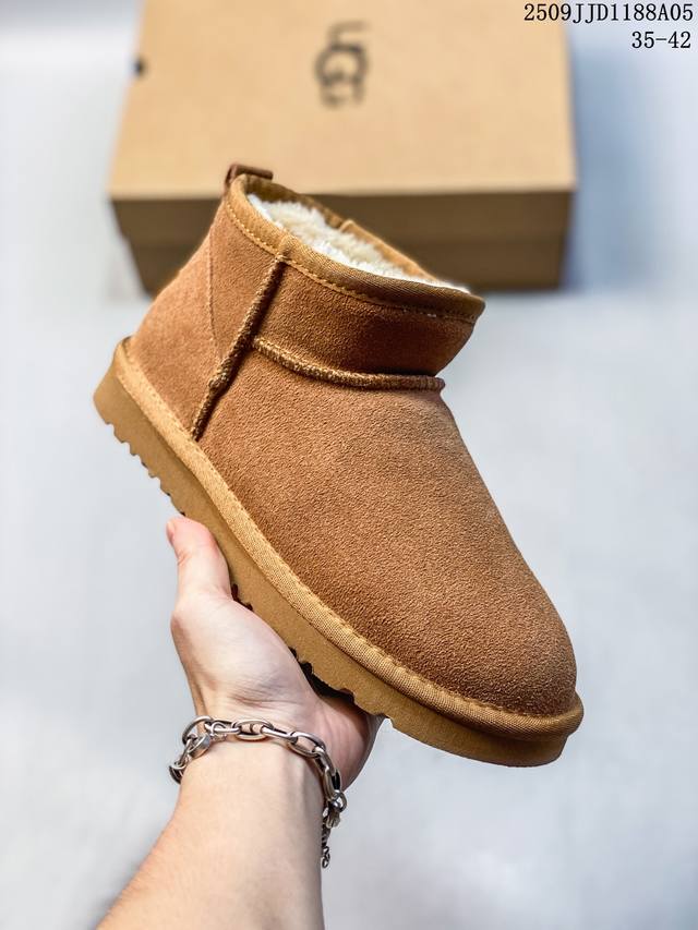 Made of TPU molded suede upper material with embedded artificial curly wool plush lining and 10mm Uggpure implanted wool lining and removable Uggpure implanted wool insole. Lightweight, non-slip and comfortable rubber outsole with brand logo and trademark. Comes with full packaging
