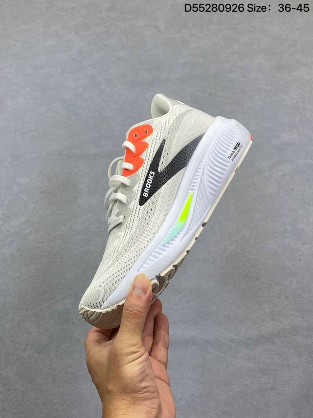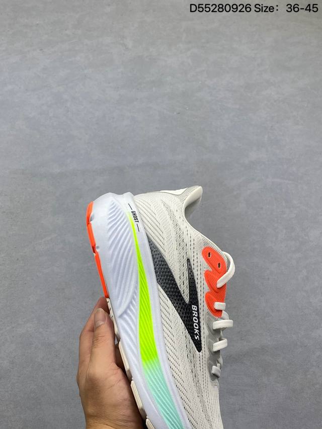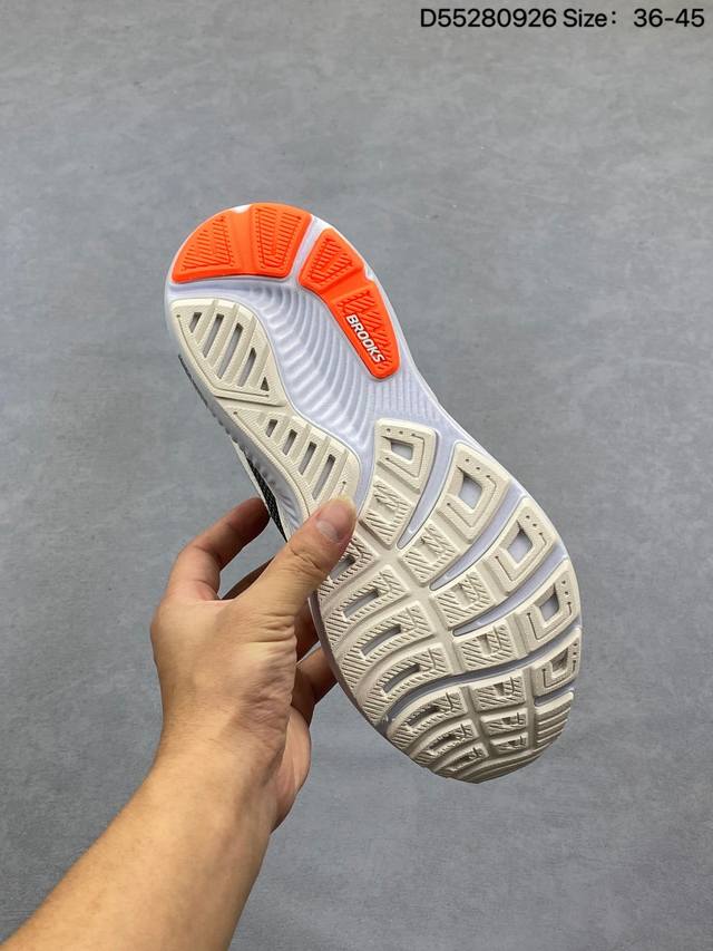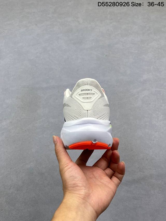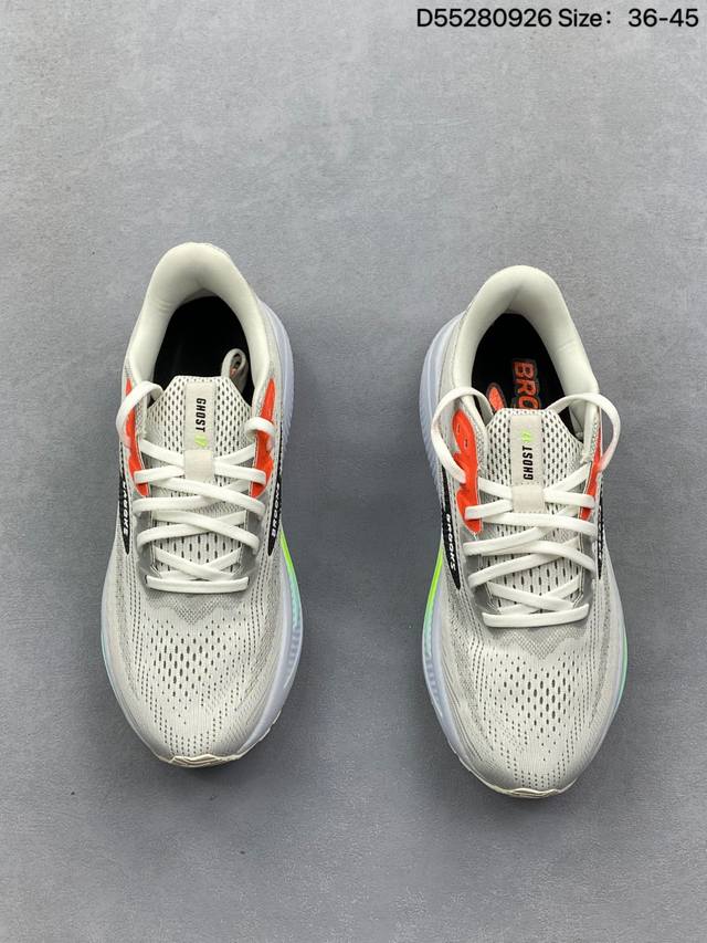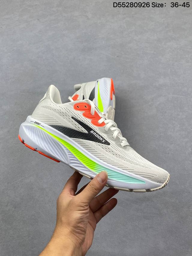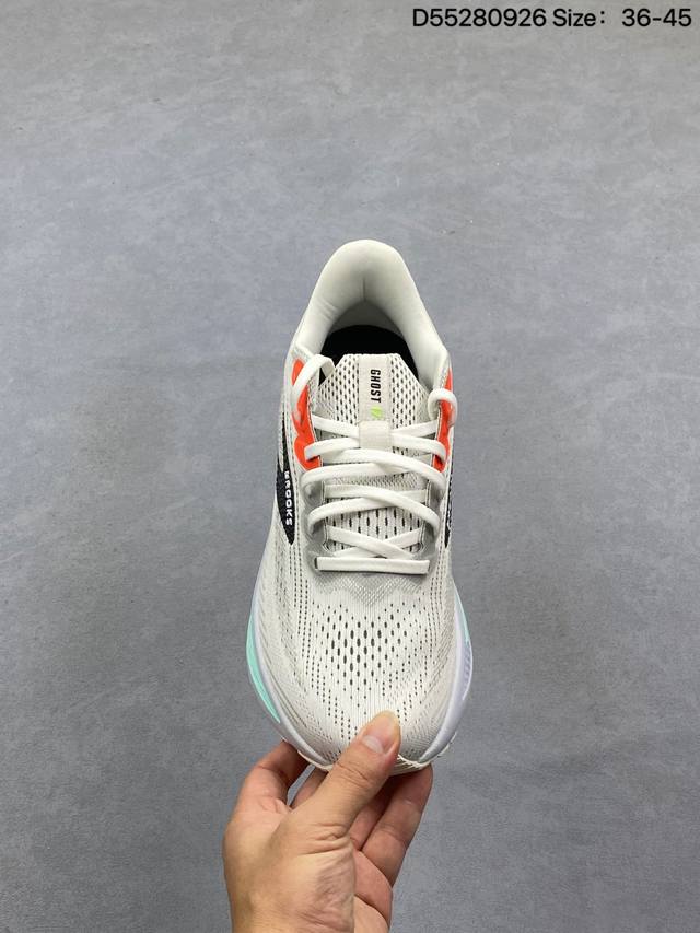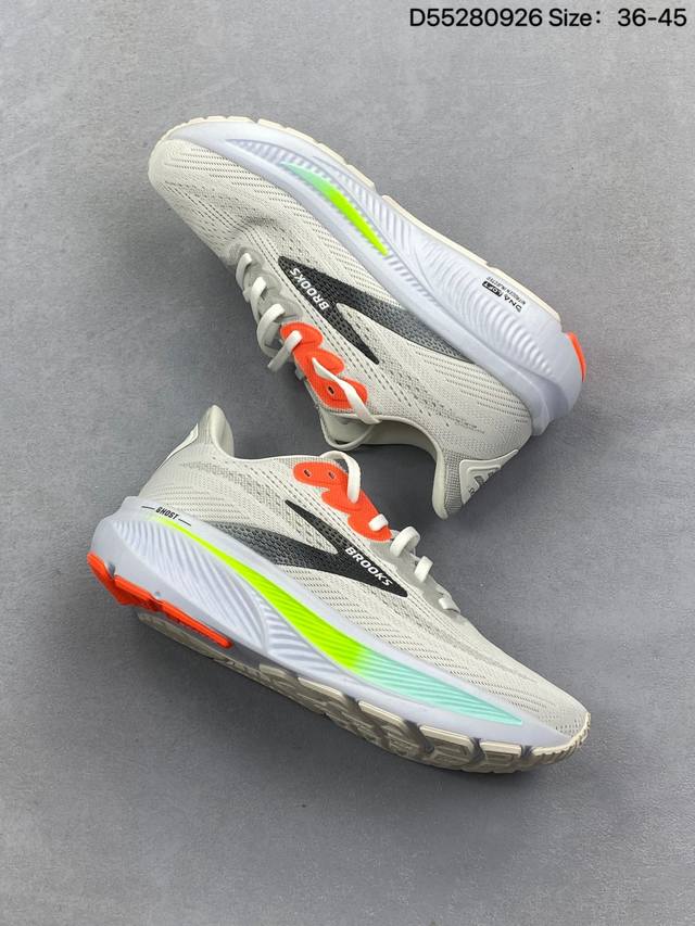 New, corporate-grade Brooks Ghost 17. A classic, thick-soled, elevated athletic dad shoe with a maxi cushion. Equipped with a Dna Loft V3 nitrogen supercritical foam midsole, it boasts a 26mm forefoot and 36mm heel, along with a 10mm slope for a soft and bouncy balance. Nitrogen injection creates a closed airbag structure, improving cushioning by 30% and energy return by 10% compared to the previous generation. Tests show that the shoe absorbs 68% of the impact force of an 80kg runner's heel strike, while rebound speed during forefoot push-off is increased by 15%. Made from a double-layer jacquard engineered mesh, the outer layer features high-density breathable mesh for rapid perspiration removal, while the inner layer features an elastic support frame for enhanced support. A 5mm wider forefoot and a thickened memory foam tongue ensure a seamless fit for runners with wide feet. The 3D molded foam in the heel and the TPU stabilizer form a double-locking structure, ensuring reliable stability under complex road conditions. Suitable for jogging paces of 5:30-6:30 km, it takes into account both cushioning and propulsion needs. The outsole contains 30% recycled polyester fiber, and the upper is made of bio-based materials. Standard and wide last versions are available to meet the needs of different foot shapes. It features "all-round cushioning" characteristics and is suitable for daily training and long-distance jogging.