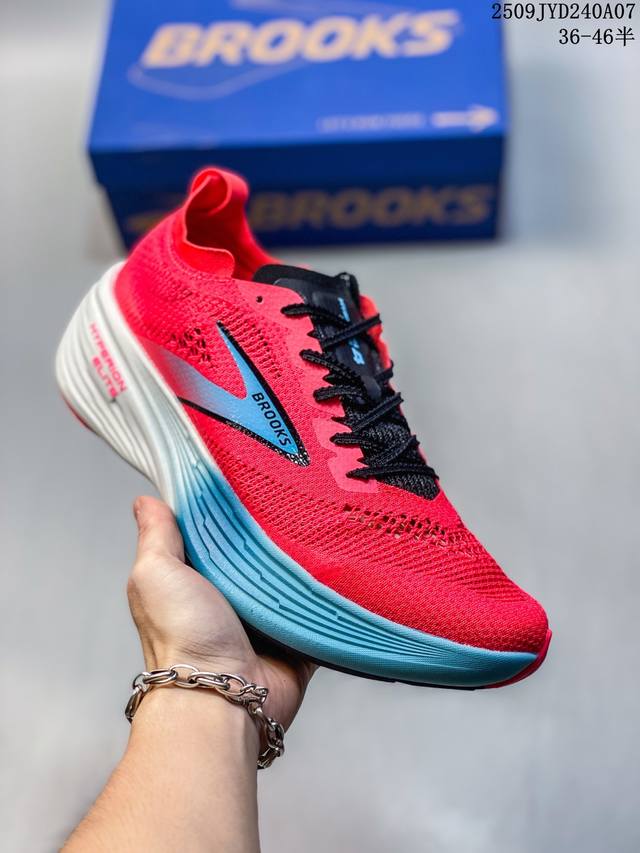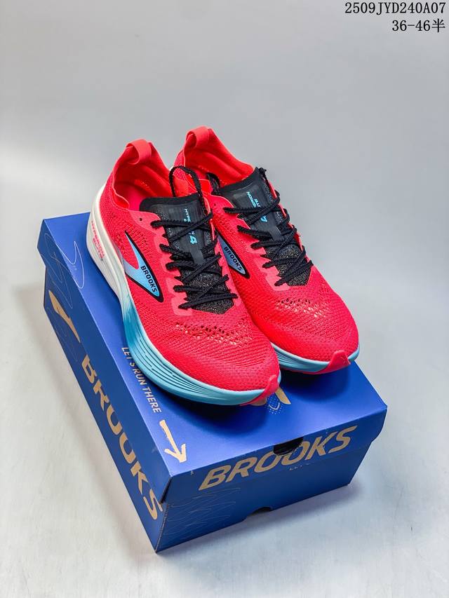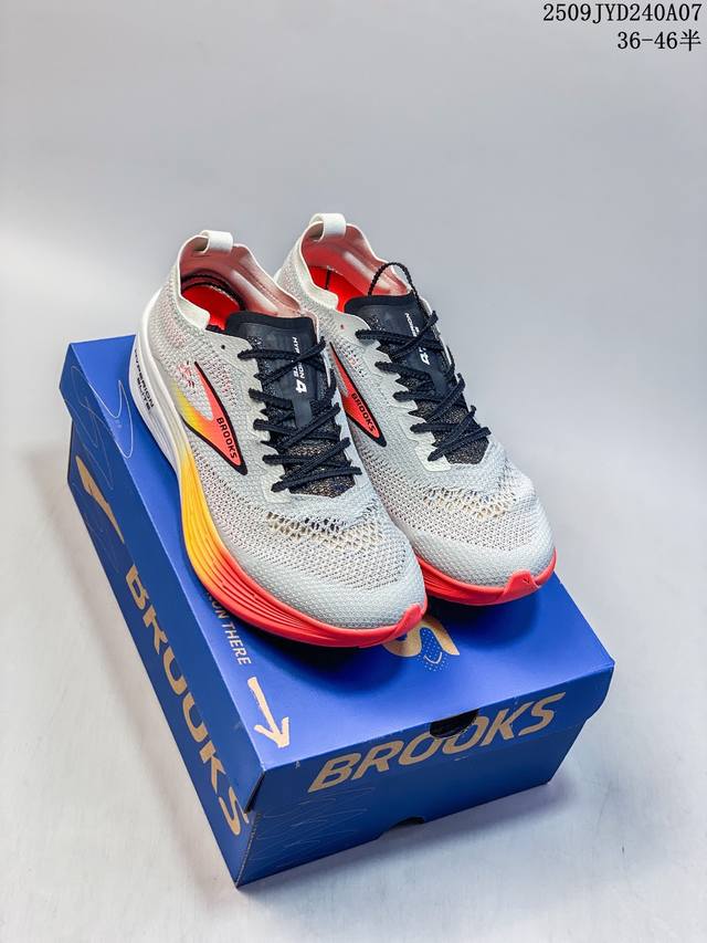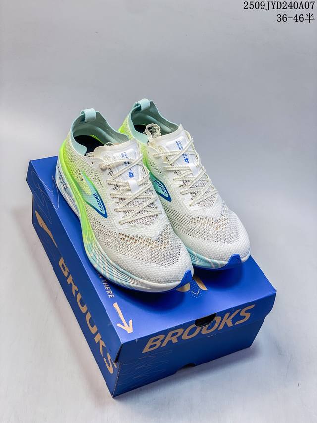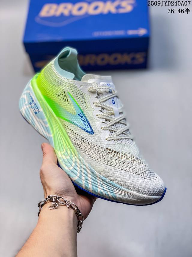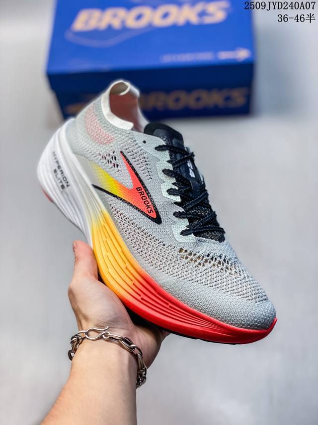New product, company-exclusive, the Brooks Hyperion Elite 4 Tornado PB Carbon Plate running shoe. This dad-style running shoe features a thick sole and increased cushioning. The Brooks Hyperion Elite 4 utilizes precision-woven, high-density jacquard mesh technology, using a zoned weaving process to achieve dynamic wrapping. Yarns of varying densities create a support structure at key areas like the instep and arch, ensuring lockdown while maintaining optimal breathability. The upper's stretchability allows the narrow-last shoe to accommodate average feet, while the velvet heel material eliminates rubbing. The Hyperion Elite 4 features a new Dna Gold nitrogen foam midsole. This 100% PEBA material significantly improves energy return while reducing weight by 11%. The midsole offers a dual-featured feel of "soft for jogging, firm for acceleration," providing a noticeable forefoot bounce during long workouts and responsive ground contact during intervals. In addition, the sole adopts Rapidroll Rocker wave-shaped midsole structure, combined with 8mm slope difference design, effectively reducing energy loss during the gait cycle.