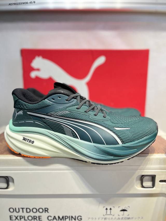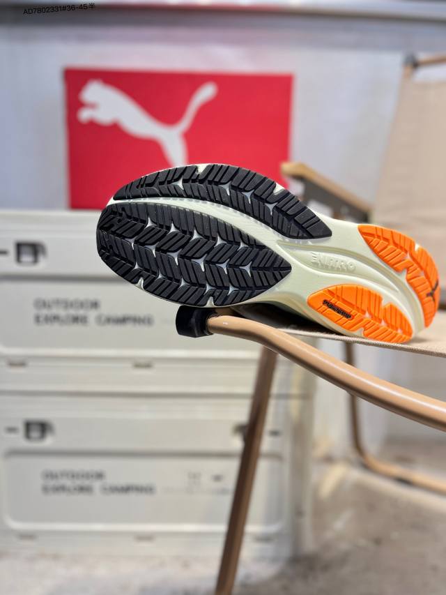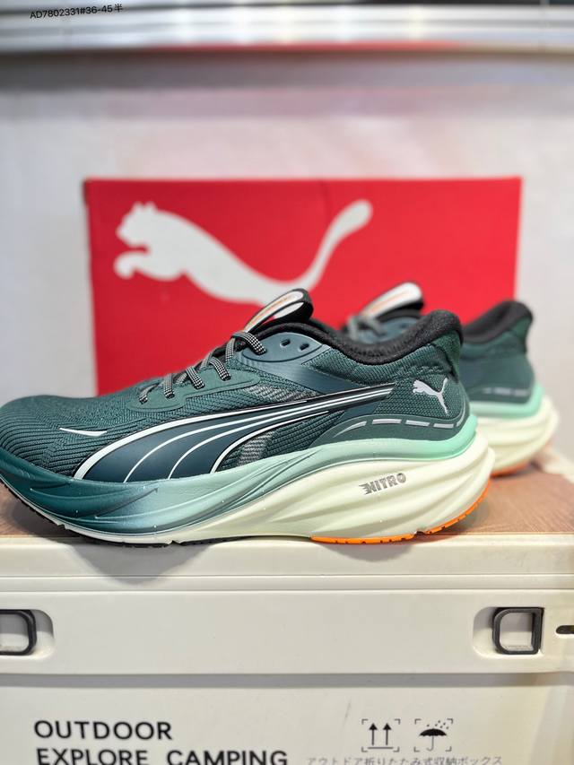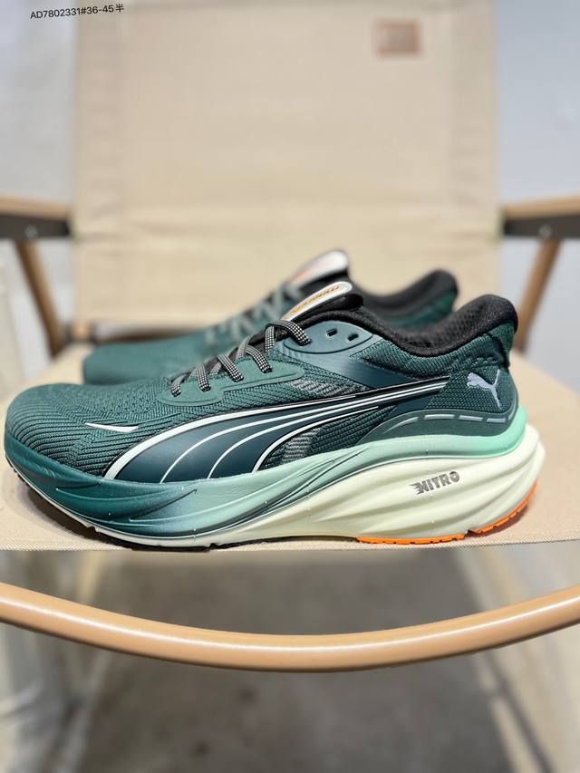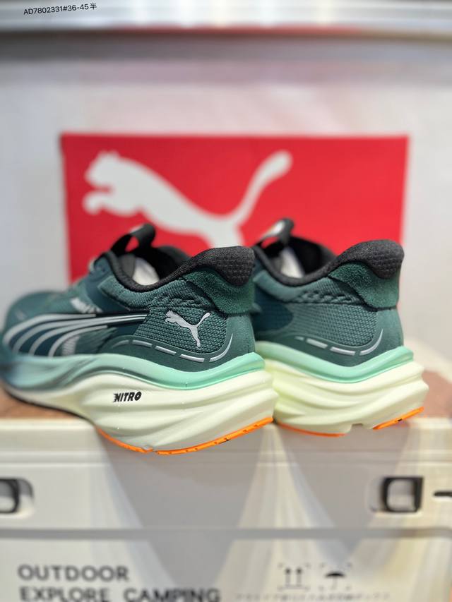 Puma Magnify Nitro 3 running shoes combine functionality and aesthetics for enhanced running performance. Featuring a Puma Nitro midsole, it boasts lightweight yet highly cushioned and responsive cushioning for a soft and comfortable feel. The clean, flowing lines of the Puma running track add a touch of dynamism to the shoe. The upper is made of lightweight, high-elastic fabric, offering breathability, comfort, and a snug fit while ensuring durability and support for rapid sprints. The supercritical Nitro midsole combined with a thick sole provides comfortable cushioning and energy return, making it suitable for both running and commuting. The Puma streamlined running track on the side is presented in bright colors, highlighting a vibrant athletic aesthetic. The outsole uses Puma Magrip rubber, providing slip resistance and durability for a flexible and agile running experience. (Item No. 311046 Ad7802331# 36-45 half)