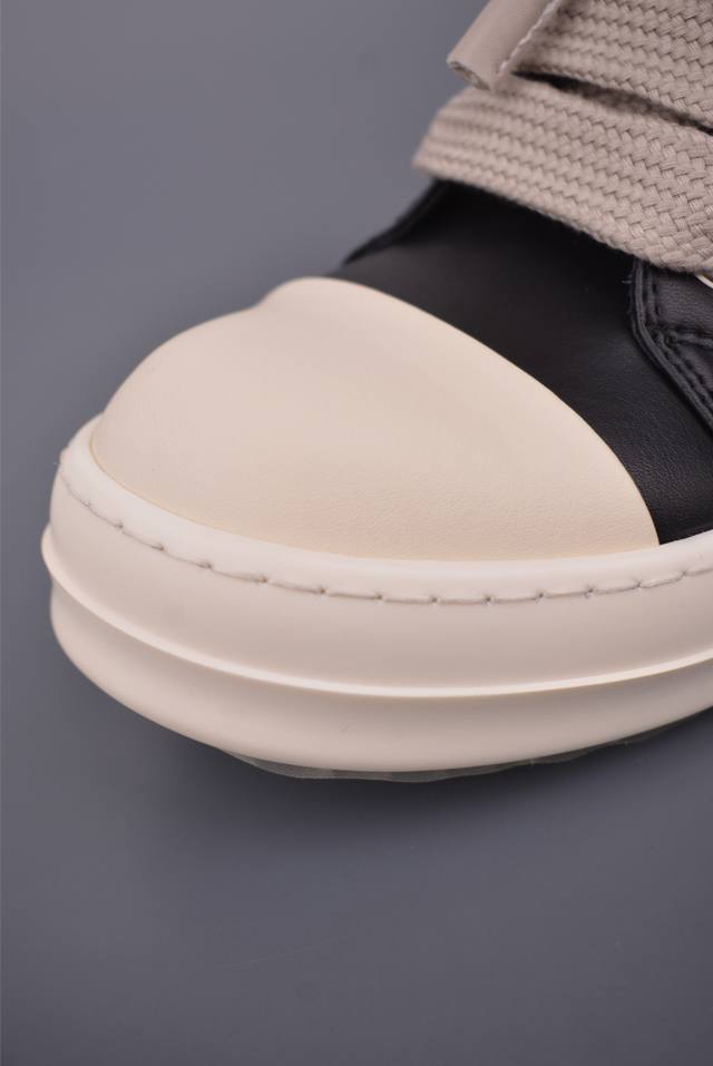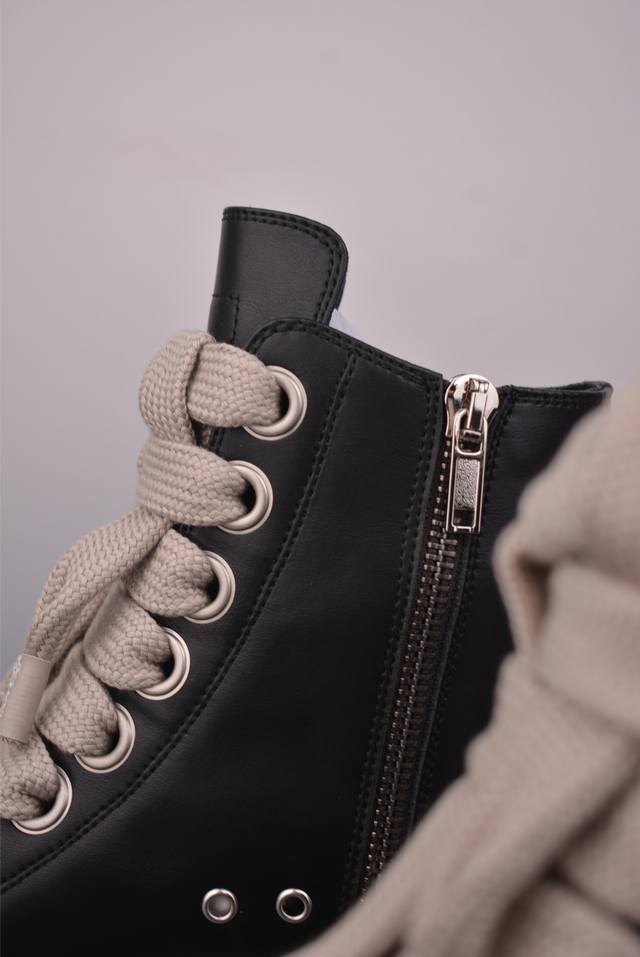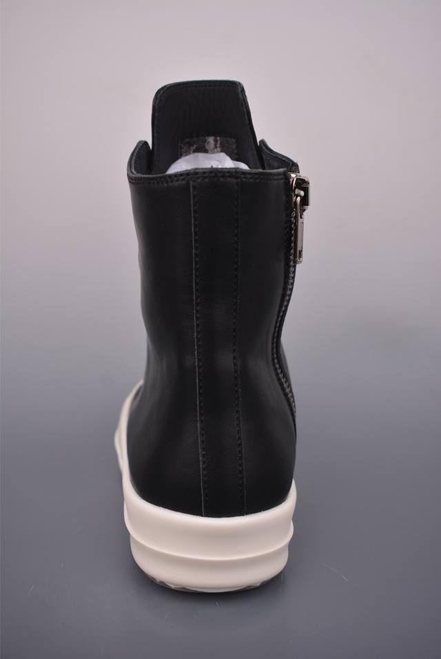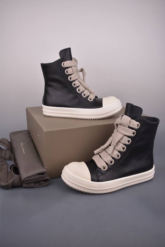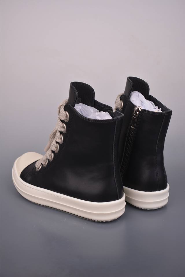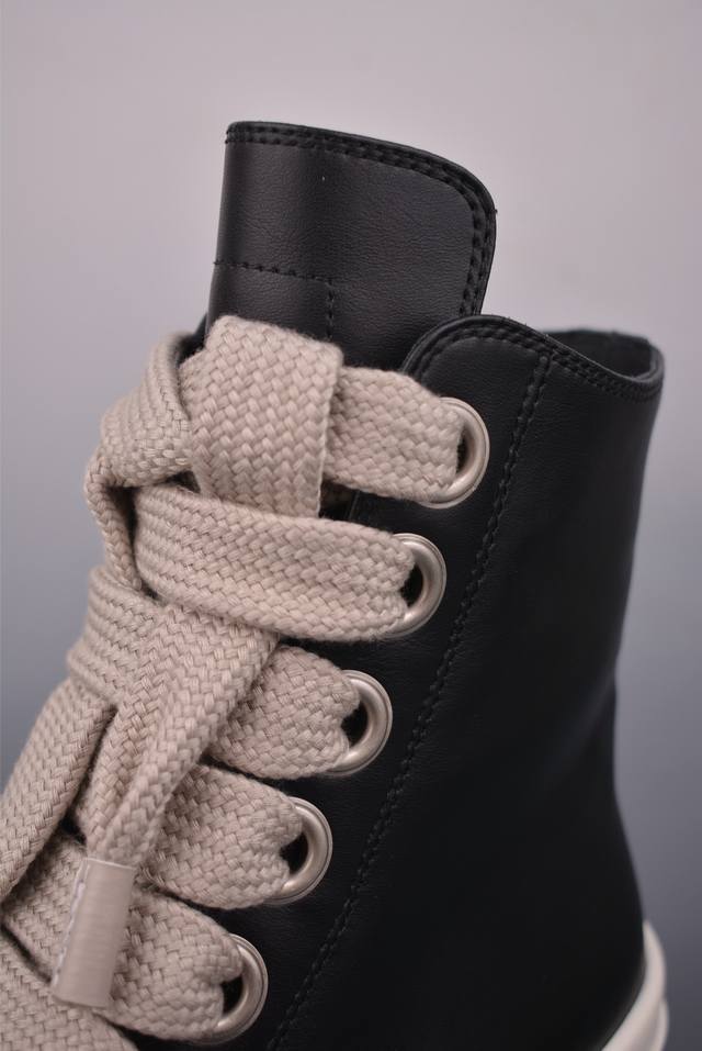 Ro Rick Owens DDD High-Top Leather Shoes with Thick Laces - Guangdong Original Version. Made with brand new 2025 imported Dongguan factory-made "tumbled grain top-layer calfskin." The shoelaces utilize a water-dyed weaving process, resulting in a high-density, lustrous finish. The zipper features custom logo engraving and a smooth, unobstructed zip. The toe is made of all-black calfskin, soft and supple, with a fine, textured feel when gently pressed. The tongue lining is also made of full-grain leather, cut from a single piece without any patchwork or scraps. The TPU outsole has a milky scent, with perfect hardness and feel against the skin. The logo on the outsole is clearly and accurately stamped. Exclusive custom mold with thickened design! DDD Insoles: One piece of cowhide leather + 3 layers of foam insert, white and pink, exclusive custom-molded perforated design. Official product number: Ru02D68923633. Sizes: 36 37 38 39 40 41 42 43 44 45 46.