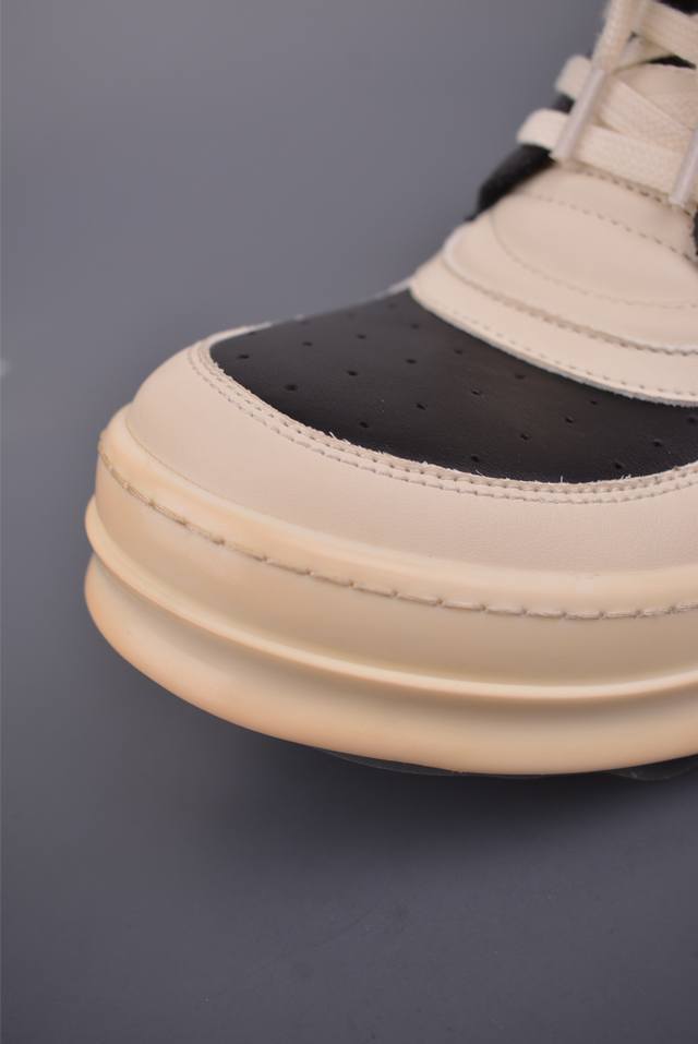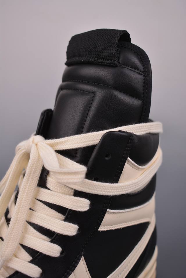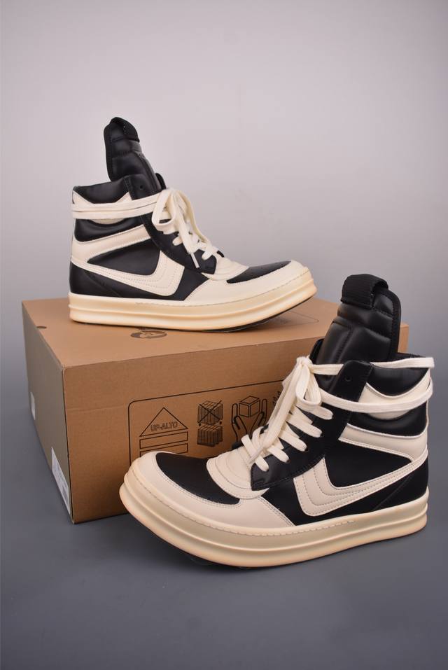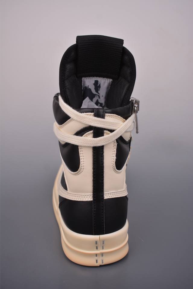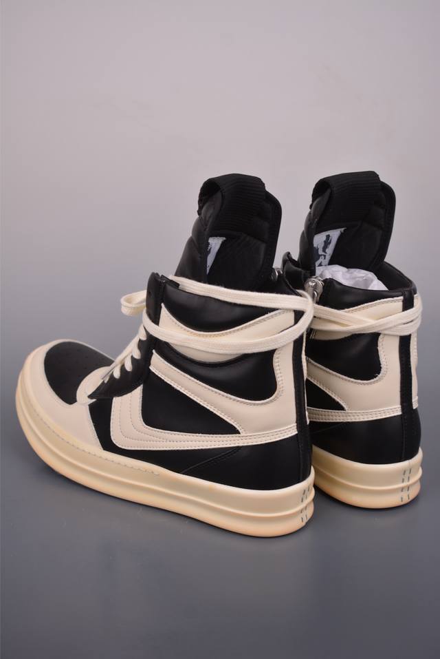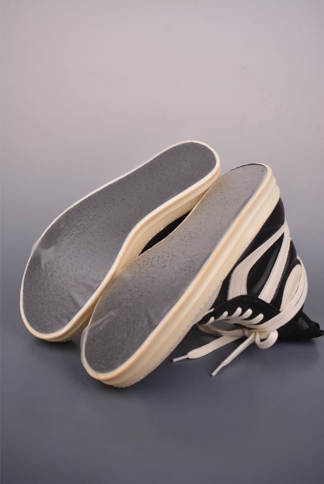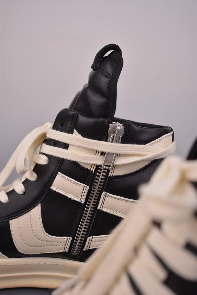 Ro Rick Owens Ddd High-Top Shoes with Thin Laces, Black and White, Guangdong Original Version. Made with brand new 2025 imported Dongguan factory-made "tumbled grain top-layer calfskin." The shoelaces utilize a water-dyed weaving process, resulting in a high-density, lustrous finish. The zipper features custom logo engraving and a smooth, unobstructed zip. The toe is made entirely of black calfskin, soft and supple, with a fine, textured feel when gently pressed. The tongue lining is also made of full-grain cowhide, cut from a single piece without any patchwork or scraps. The TPU outsole has a milky scent, with perfect hardness and feel against the skin. The logo stamp on the outsole is clear and accurate. Exclusive private mold with thickened design! Ddd insoles are made of a single piece of cowhide leather with 3 layers of foam filling, in white and pink. They feature exclusive custom-molded perforations. Official Ddd product number: Ru02C1113633. Sizes: 36 37 38 39 40 41 42 43 44 45 46.
