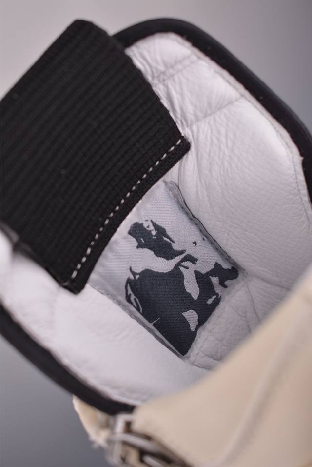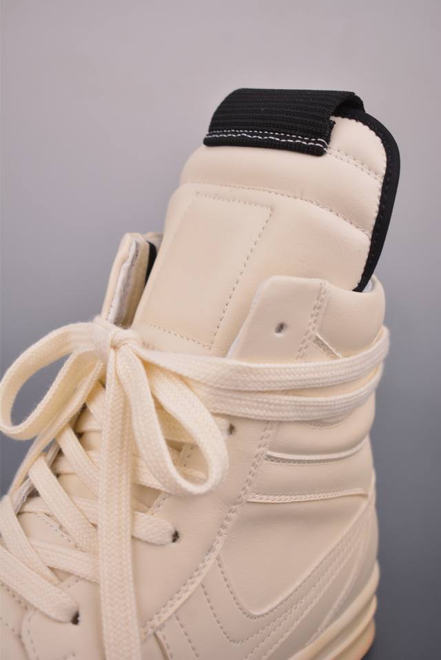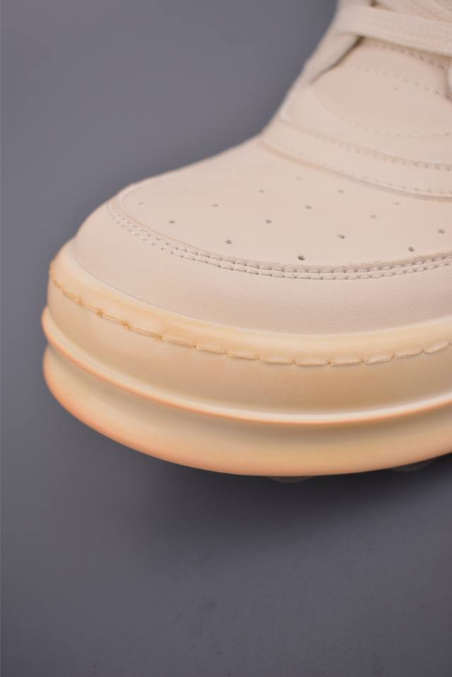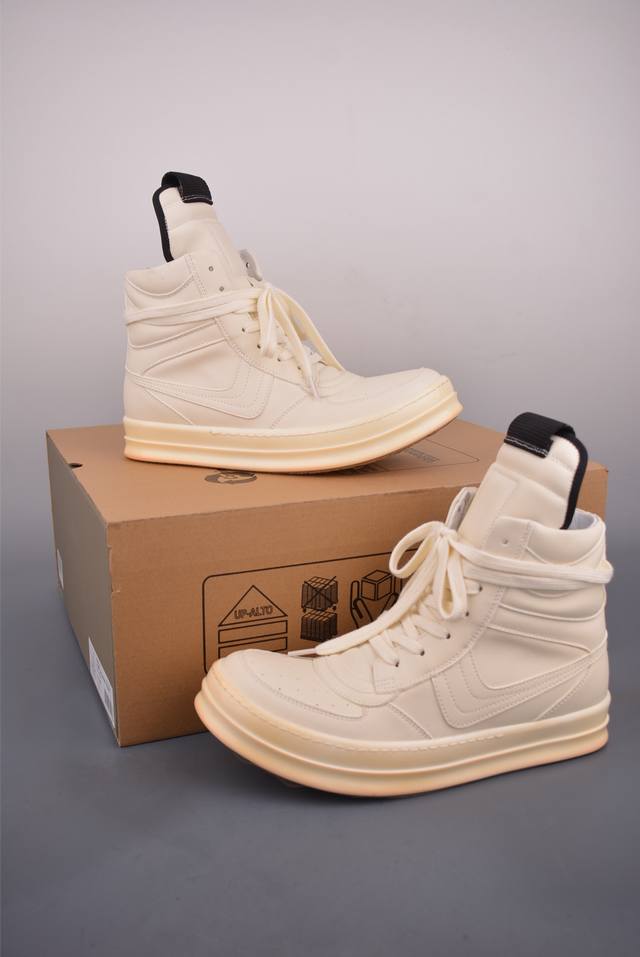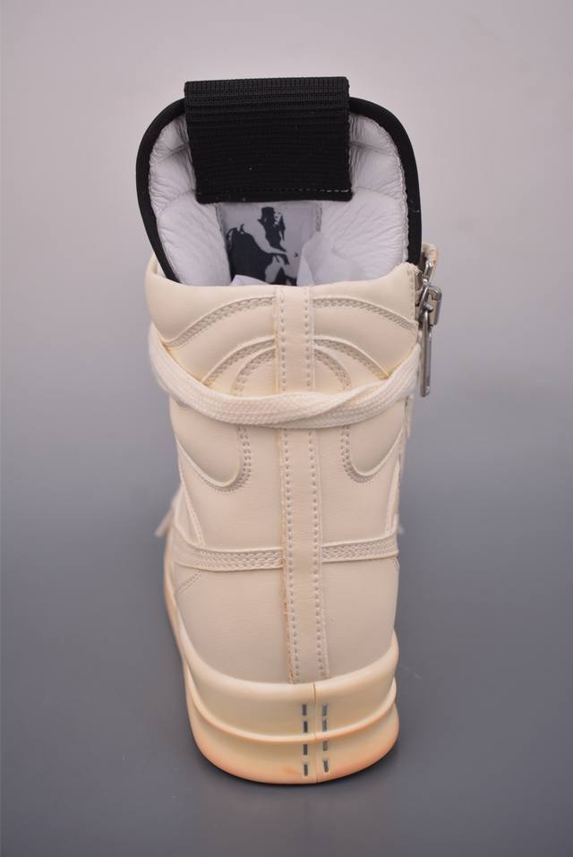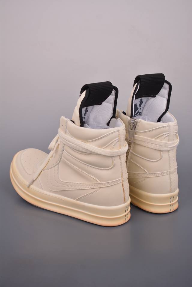 Ro Rick Owens Ddd High-Top Shoes with Thin Laces, Off-White, Guangdong Original Version. Made with brand new 2025 imported Dongguan factory-made "tumbled grain top-layer calfskin." The shoelaces utilize a water-dyed, custom-woven process, resulting in a high-density, lustrous finish. The zipper features custom logo engraving and a smooth, unobstructed zip. The toe is made of all-black calfskin, soft and supple, with a fine, textured feel when gently pressed. The tongue lining is also made of full-grain cowhide, cut from a single piece without any patchwork or scraps. The TPU outsole has a milky scent, with perfect hardness and feel against the skin. The logo stamp on the outsole is clear and accurate. Exclusive private mold with thickened design! Ddd insoles are made of a single piece of cowhide leather with 3 layers of foam filling, in white and pink. They feature exclusive custom-molded perforations. Official Ddd product number: Ru02C1123633. Sizes: 36 37 38 39 40 41 42 43 44 45 46.