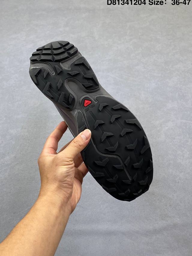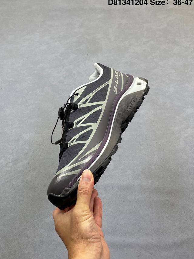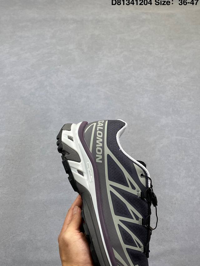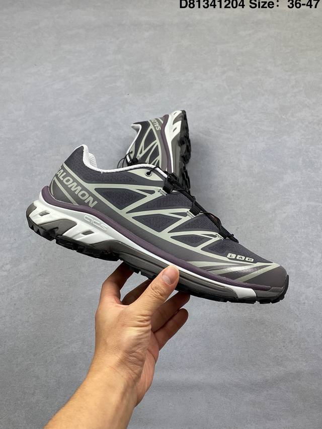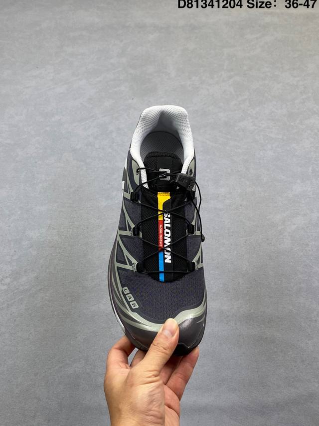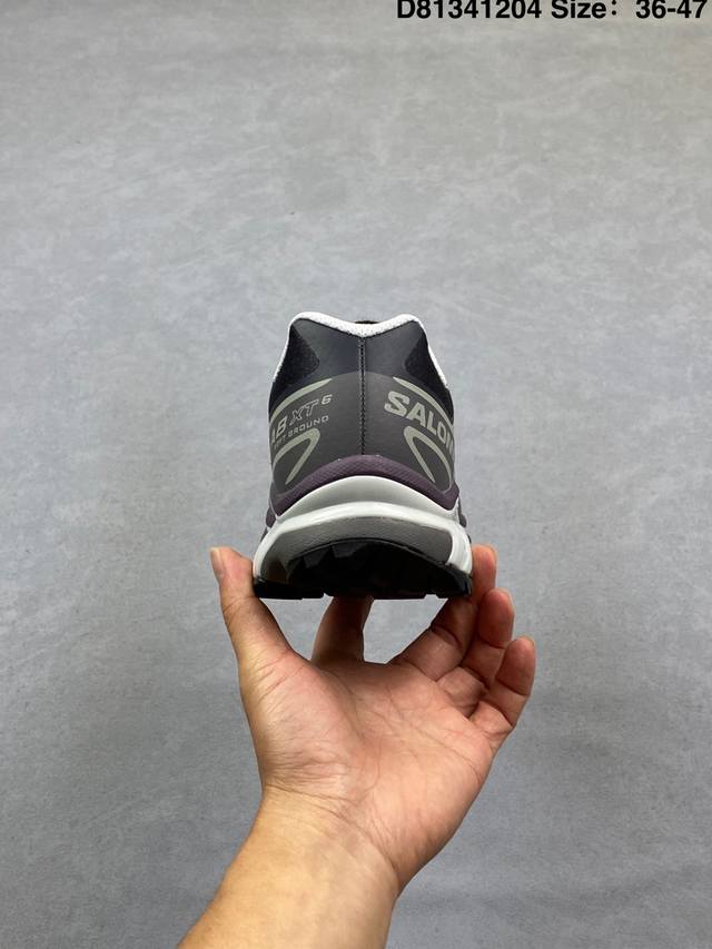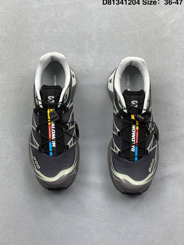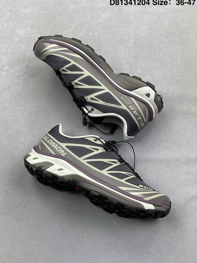 Salomon XT-6 Retro Trendy Outdoor Functional Hiking Running Shoes. A masterpiece developed over six months using original cardboard lasts and factory-supplied mesh fabric to ensure authentic and perfect presentation. Original design data, exclusive private mold, five-layer combination outsole, men's and women's shoes synchronized with official development up to size 46.5. Features include an original Ortholite lightweight insole, midsole with stamped serial number, original TPU buckle, imported heel counter, and a naturally full heel. The upper features a "serrated" wrapping system against a base color, incorporating various colored accents. This blends the company's latest technology and fashionable design into a durable long-distance running style. The upper is made of TPU film welded to a highly abrasion-resistant mesh, making it both stylish and sturdy. An ACS chassis enhances stability and support, while an EVA cushioning midsole covered with a Contragrip outsole with rubber lugs is designed for rough terrain. The tongue features a colorful Salomon label and Quicklace. The system, along with the additional branding on the toe, tongue, and heel, perfects the details, allowing wearers to easily handle any sporty or casual occasion, whether outdoors or commuting. The seamless upper provides freedom of movement outdoors, combining style and comfort for both everyday wear and serious occasions. It's sure to turn heads on the street or for commuting