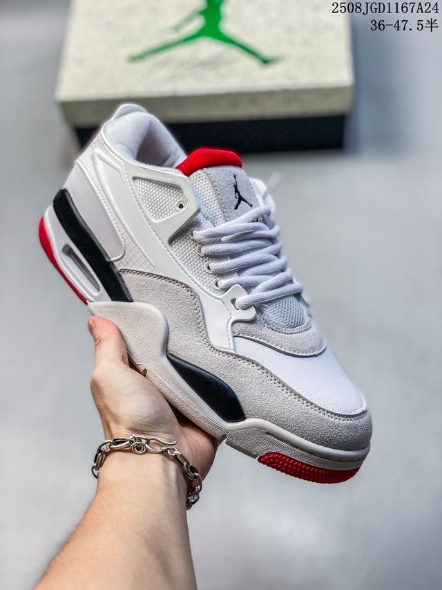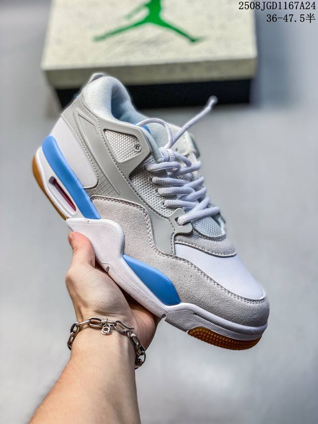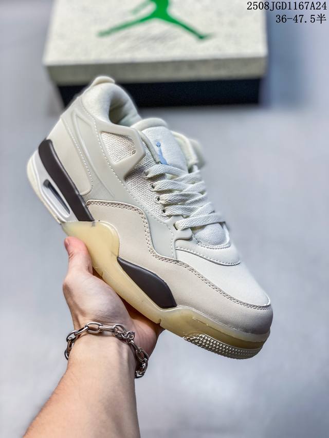 The Air 4 Rm Legend Light Brown Reset Off-White 4, the 4th generation 4, the Joe 4 Reset Off-White basketball shoe series, is crafted from leather and suede. The upper is primarily off-white leather, with a beige suede frame at the toe. While retaining the classic Air 4 shape, the original mesh is removed. Beige laces enhance the shoe's overall look. A beige label on the tongue features a white Jumpman logo and Flightt branding, highlighting the shoe's identity. Beige TPU material is used on the upper and heel tabs, adding a touch of color. A beige Swoosh logo and Air are featured on the heel. The midsole continues the previous model's split, visible Air Sloeh unit. The off-white midsole and matching rubber outsole complete the design.