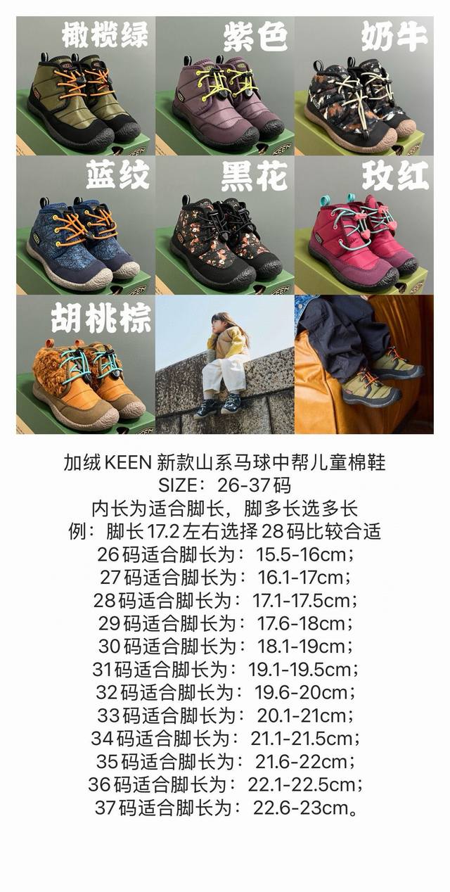 New Keen Mountain Style Polo Mid-Top Children's Cotton Shoes with Fleece Lining DDD Size: 26-37 DDD Trendy Keen Series DDD Fleece-lined heel, unlined front DDD Mid-top style, warm and windproof DDD Durable and non-slip rubber outsole, super comfortable DDD Delicate elastic buckle, super easy to put on and take off DDD