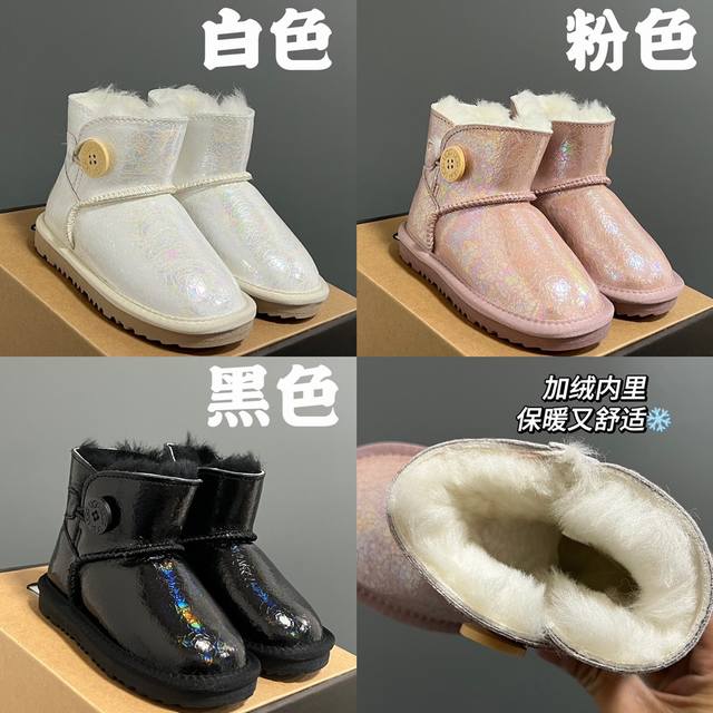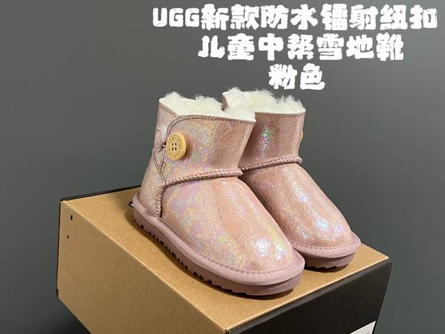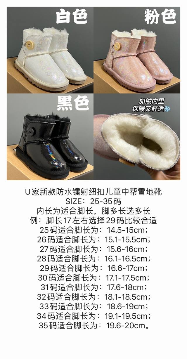 New Ugg Wool-lined Waterproof Laser Button Children's Mid-top Snow Boots Size: 25-35 Classic Ugg style Mid-top design, warm and windproof Waterproof laser series, high-quality feel Wear-resistant and non-slip rubber outsole, super comfortable on the feet