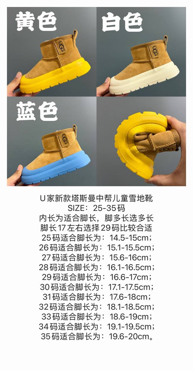 Ugg Tasman Mid-Cut Kids Snow Boots, Sizes 25-35 DDD Super cool Ugg color-blocked slip-on design, easy to put on and take off, fleece-lined and thickened lining, warm and comfortable DDD
