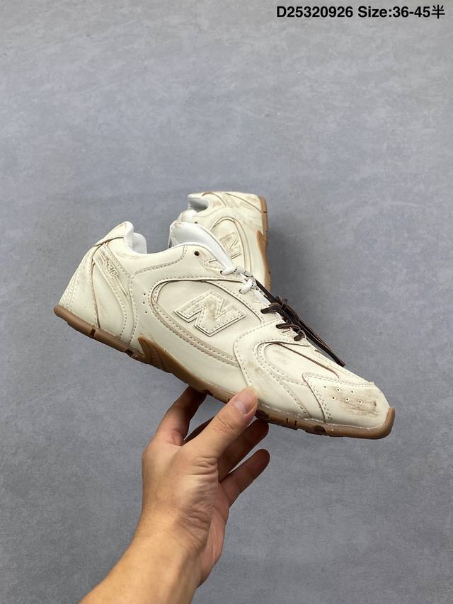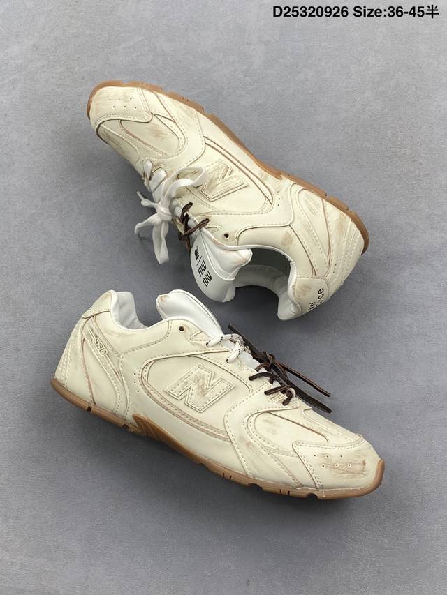 The outline of the New Balance 530 is covered with fabric that resembles vintage days. The leather tones are deliberately worn unevenly