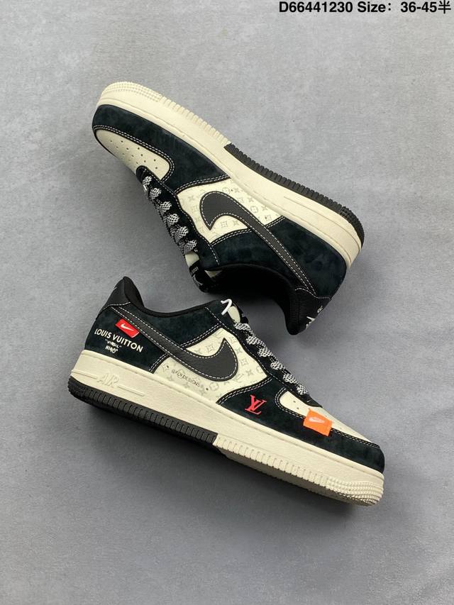A classic collision, a new chapter in luxury! When the streetwear DNA of the Nike Air Force 1 meets the haute couture elegance of Louis Vuitton, this collaborative sneaker becomes a perfect fusion of trend and luxury. Off-white suede and embossed Monogram leather are layered to create a delicate texture, while the laser-etched Swoosh logo refracts iridescent light. The red "LV" lettering and the "Louis Vuitton" lettering on the side provide visual highlights, and the black and white color-blocked midsole continues the classic silhouette of the Af1. Every detail blends street style with high-end sophistication, offering a fresh interpretation of the classic silhouette and a landmark piece in the crossover between luxury and streetwear. Wearing it instantly makes you the center of attention, allowing you to stand out in the fashion world. Product Code: Kd6699-F06 Sizes: 36, 36.5, 37.5, 38, 38.5, 39, 40, 40.5, 41, 42, 42.5, 43, 44, 44.5, 45 Code: D66441230