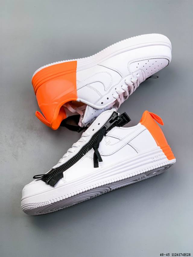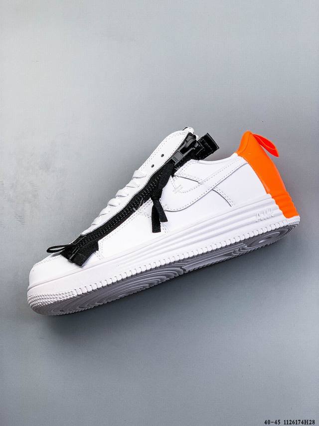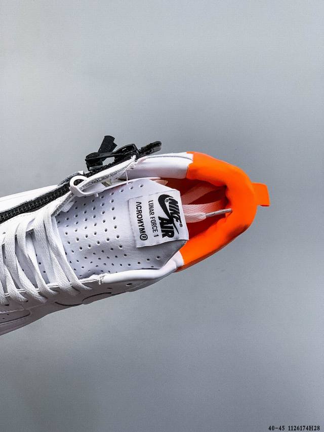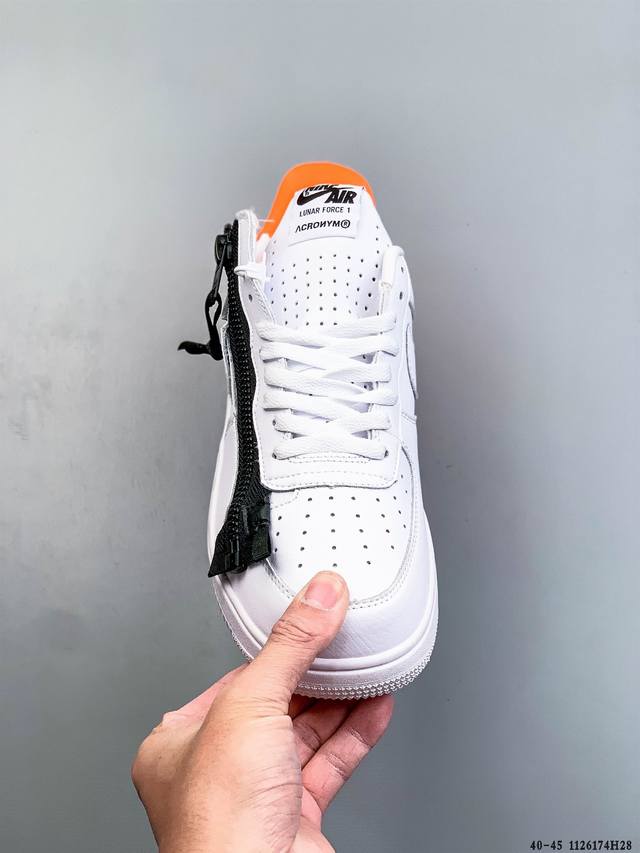 Acronym X Nike Lunar Force 1 Collaboration Zippered Casual Fit Durable Low-Top Sneakers DDD This Nike Lunar Force 1 X Acronym collaboration features a pure Triple White color scheme. It retains the low-top Lunar Force 1 silhouette, incorporating a functional zipper for high recognizability and a strong visual impact. DDD Style Code: 698699-001 DDD 1126174H28 DDD