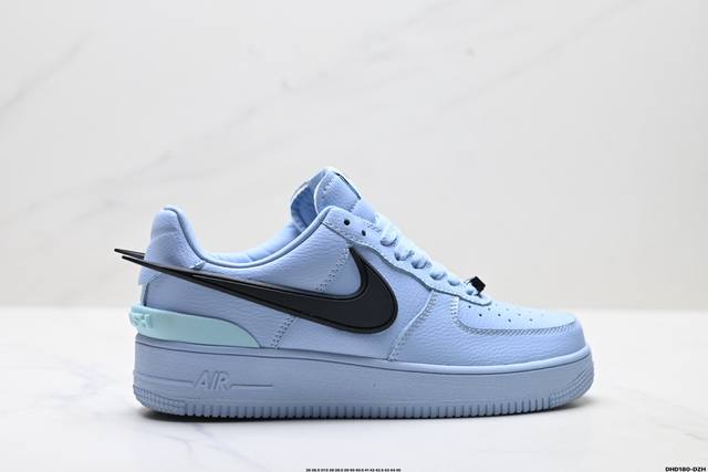 Authentic Ambush X Nike Air Force 7 Low Collaboration Low-Top Casual Sneakers. The shoe features a solid-color leather upper and lining, with the iconic oversized Swoosh prominently displayed. The tongue tag also features the Nike logo. The laces have unique buckle designs, and the heel incorporates a TPU design. Style Code: Dv3464-500. ID: Dhd -Dzh.