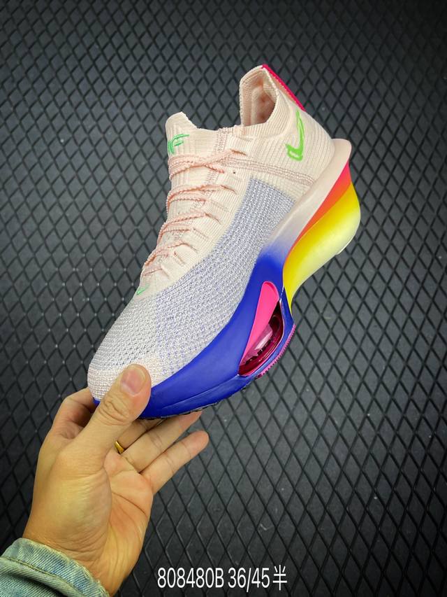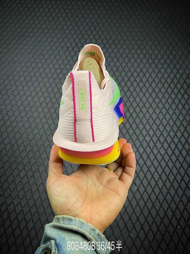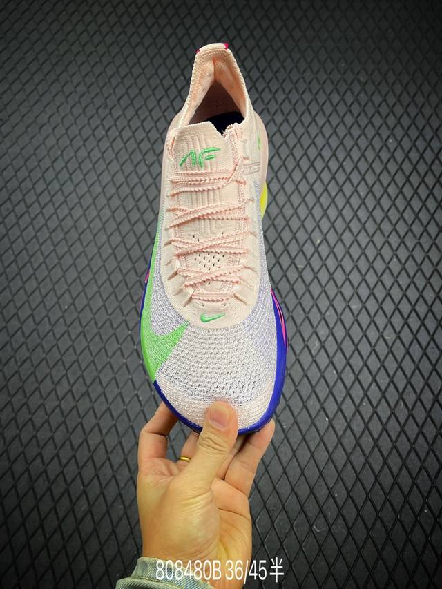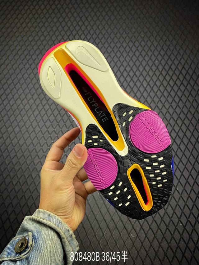 #The shoe features two Airzoom cushioning units and a full-length carbon fiber plate for excellent propulsion; the Zoomx midsole extends from the heel to the toe for superior rebound.