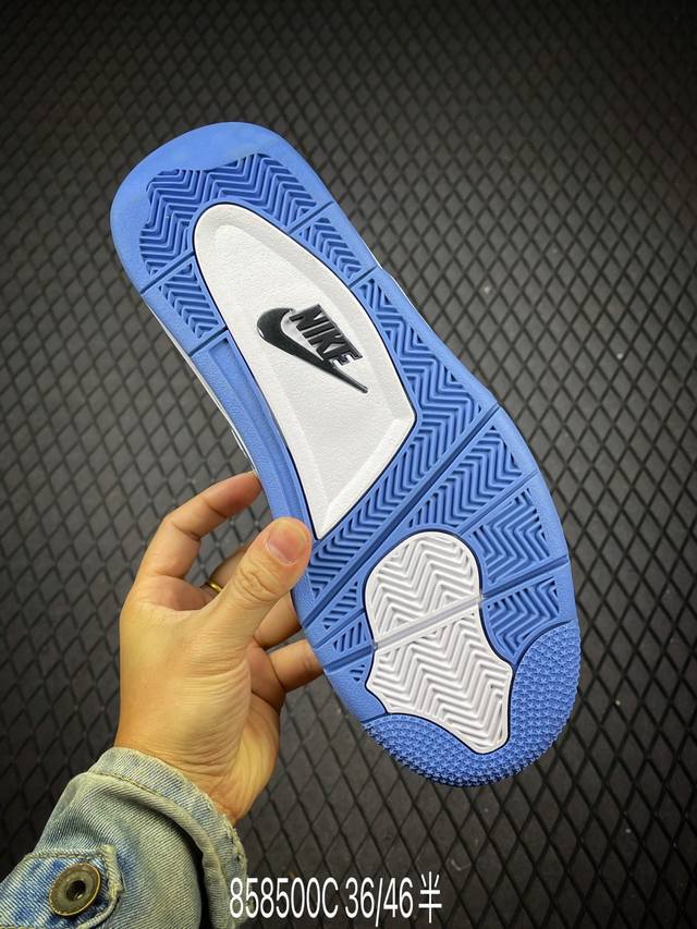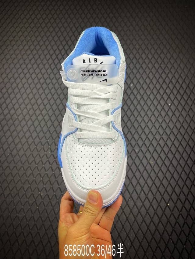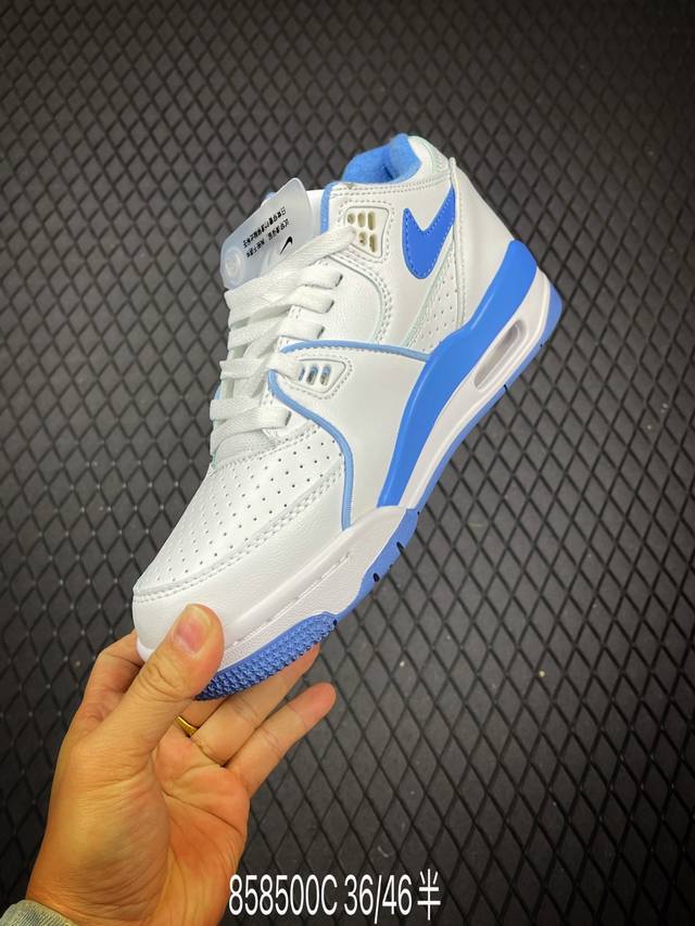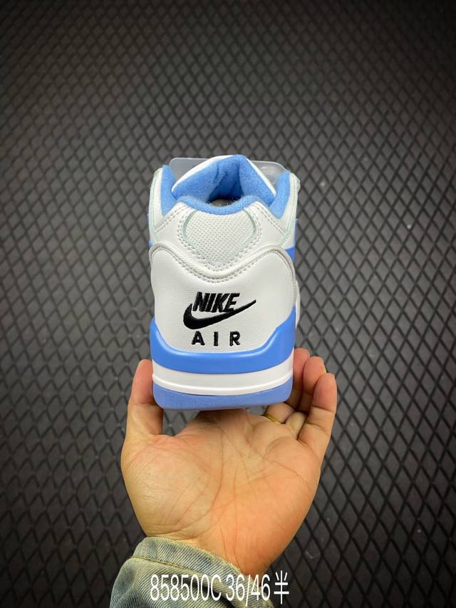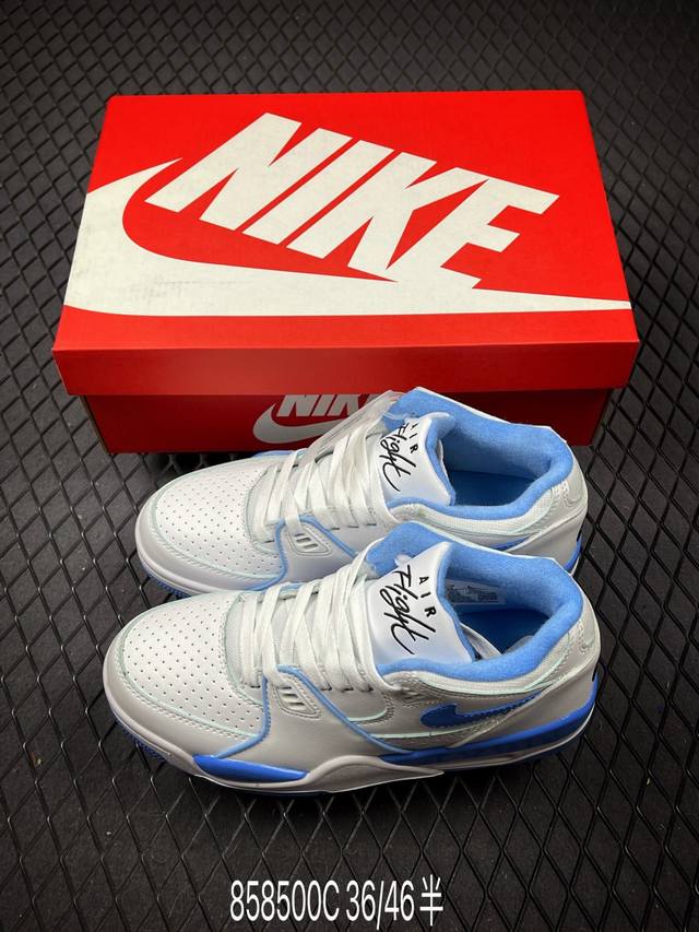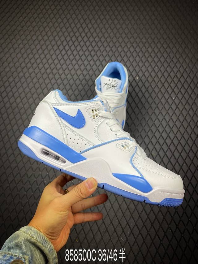 The classic Nike Air Flight 89 blends elements of the Air Jordan 3 and Air Jordan 4, making it highly sought after by many fashion enthusiasts. The midsole features a visible Air unit reminiscent of Air Jordans, with light blue accents on the forefoot echoing the collar.