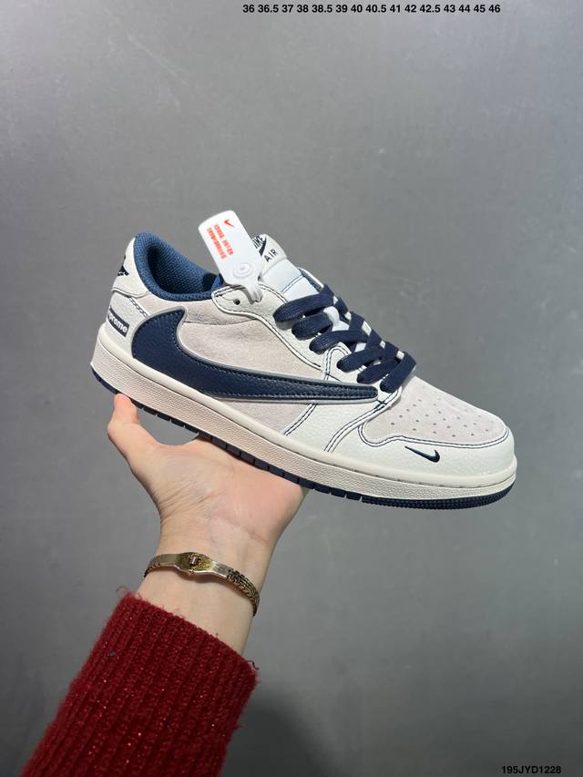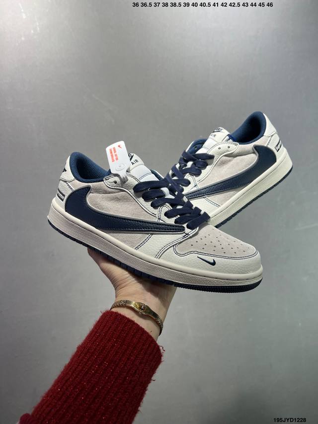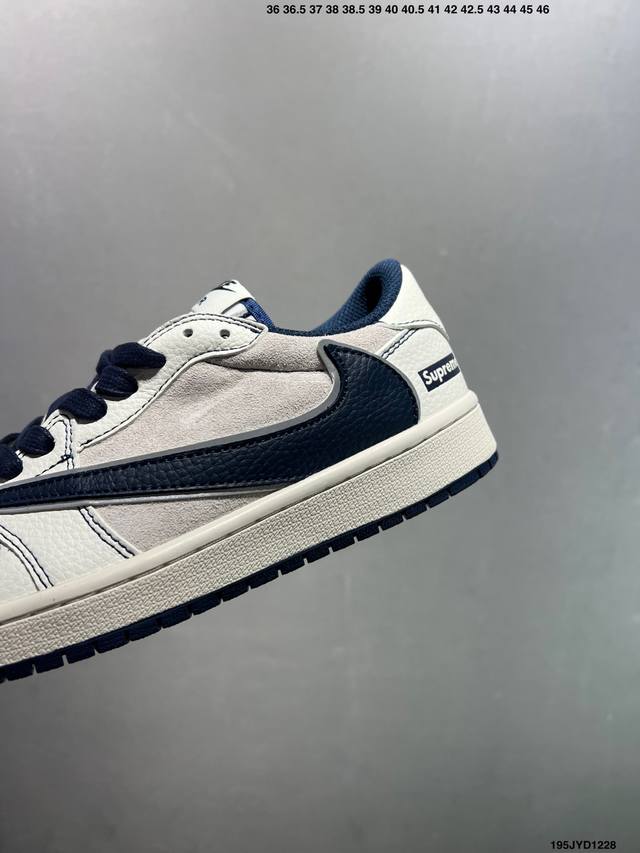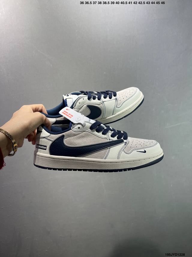 Company Grade Travis Scott X Nike Air Jordan 1 Low X Supreme Collaboration. This Air Jordan 1 Low features a reverse Swoosh design. The entire shoe is made of original top-grain leather, with solid materials and meticulous craftsmanship. The shoe shape is perfectly replicated, with 3D printing improvements for a deep, three-dimensional look. The four-stripe midsole, upper material, and steel-stamped adhesive are all included. It's a brand new batch with original molds and a custom-made outsole. The entire shoe uses original factory-customized leather with a delicate feel and perfect folding craftsmanship. Official Product Code: Xz2268 001. Sizes: 36, 36.5, 37.5, 38, 38.5, 39, 40, 40.5, 41, 42, 42.5, 43, 44, 44.5, 45, 46. ID: 195Jyd1228