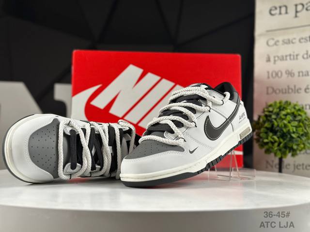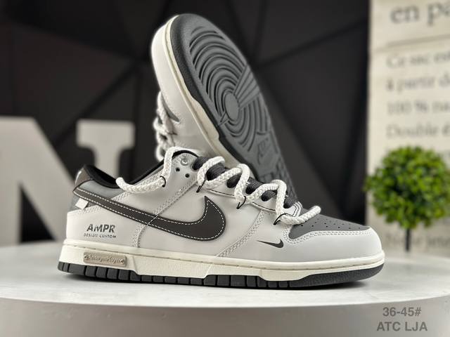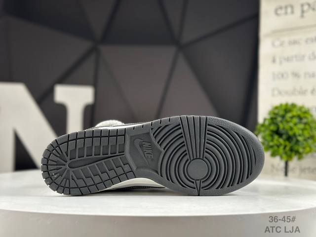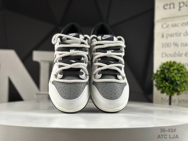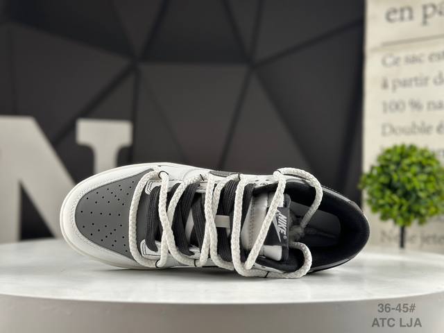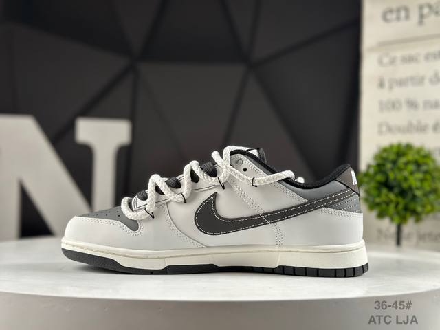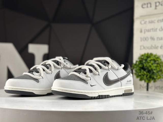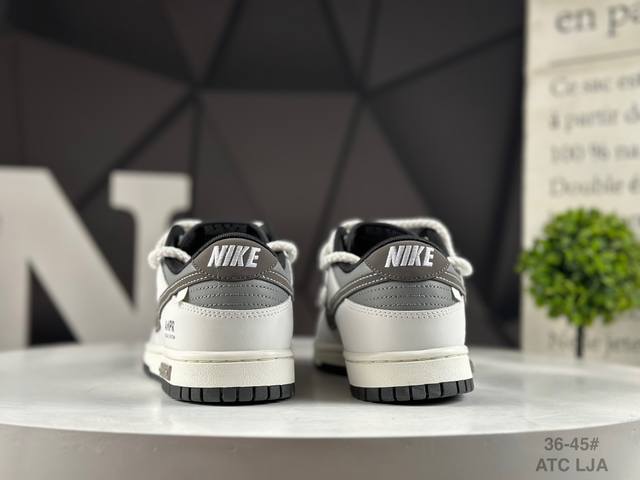 Corporate-grade Nike Dunk Low: A Youth-like Feel. This style features a textured white matte leather upper, reminiscent of fresh snow falling on a mountain ridge. The charcoal black Swoosh creates a sharp arc, like a young man's vigor bursting through the air. The gray tones of the toe and collar create a three-dimensional layer; the heel is embossed with a mottled, distressed font, highlighting its custom pedigree. With a pure base, it withstands the vicissitudes of life while remaining as sincere as ever, a youth-like feeling.