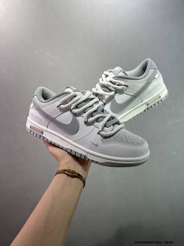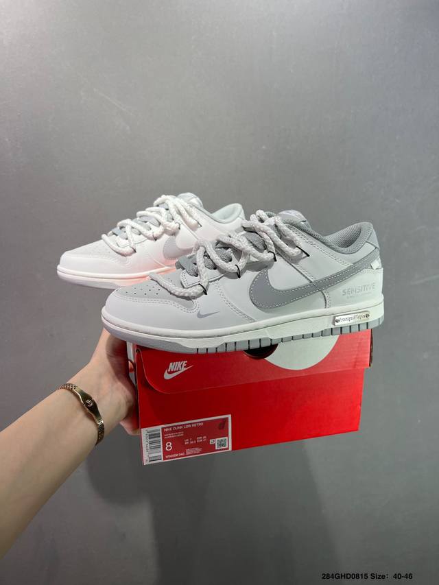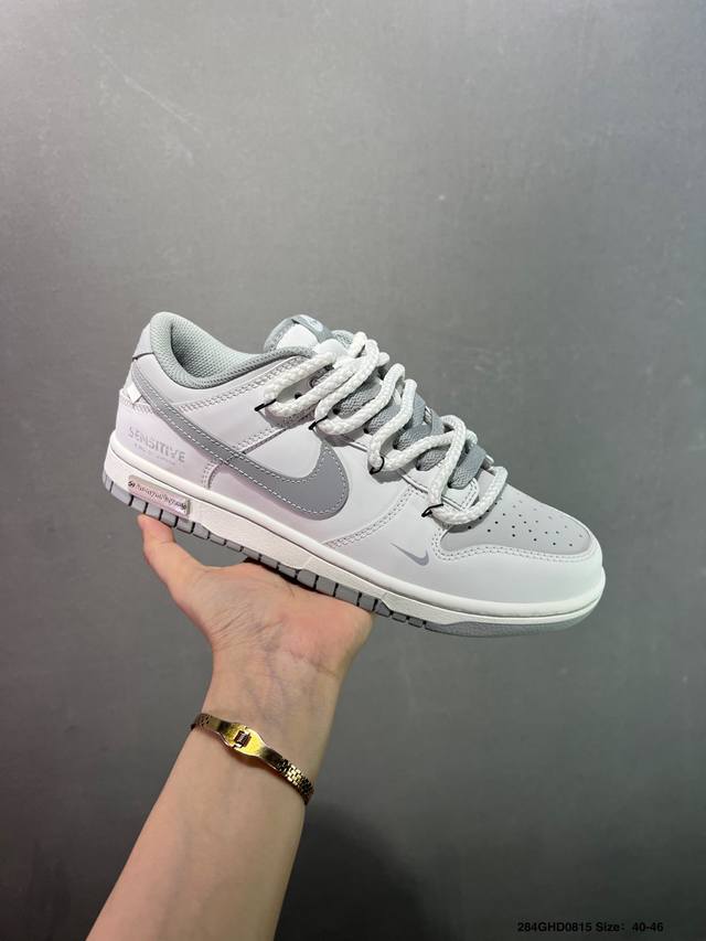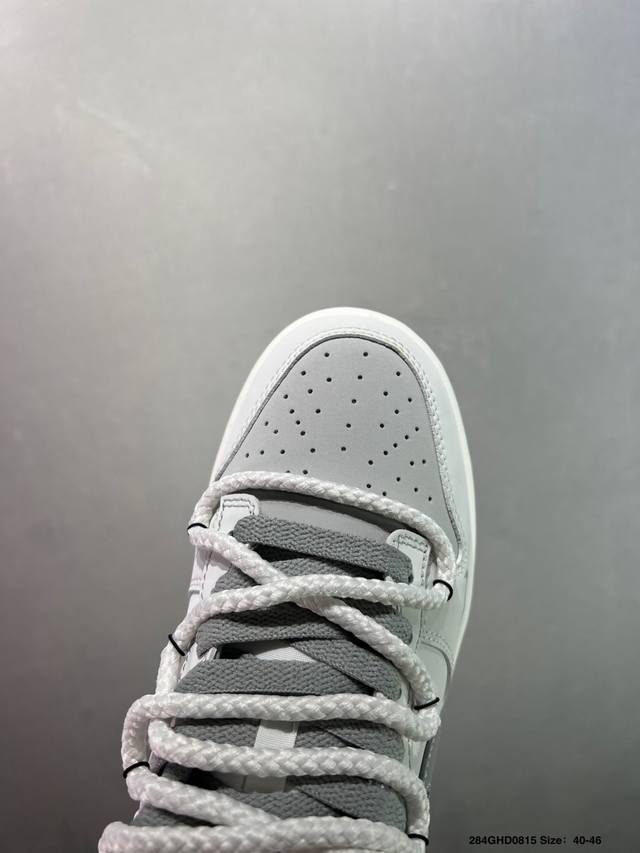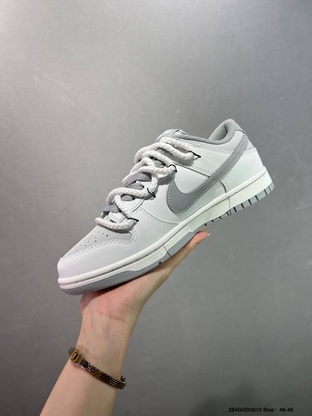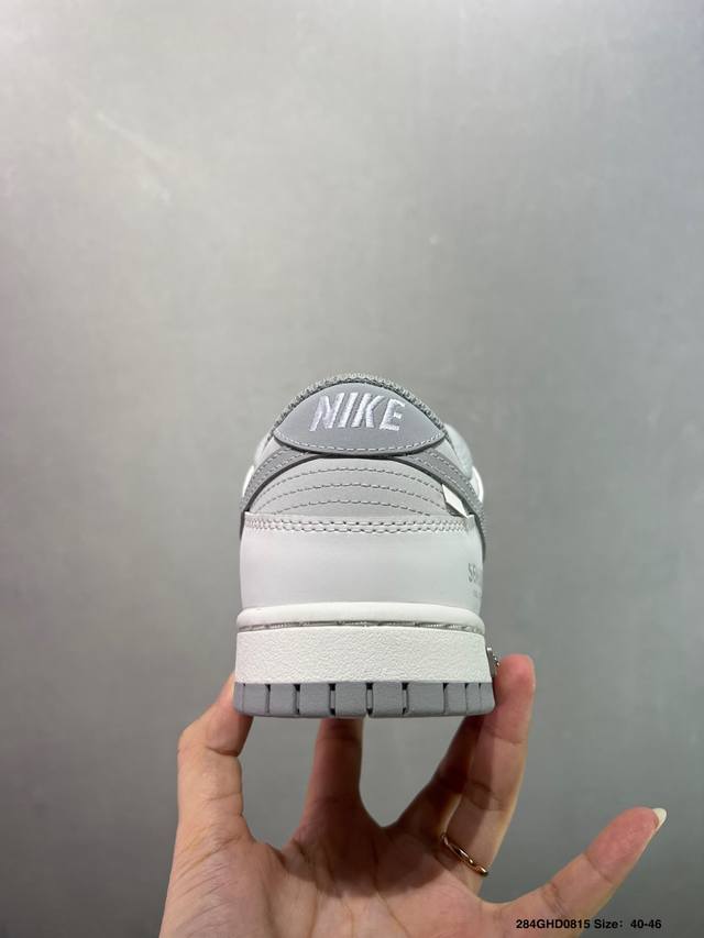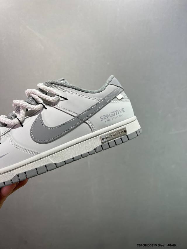 Corporate-grade Nike Dunk Low, the uncrowned king. This style features a minimalist white base, with a matte texture and matte leather stitching. The visual layering is like a double rhyme. The gray Swoosh cuts through the melody, creating a subtle yet sophisticated feel. The rough ties embody a deconstructed aesthetic, paying homage to the rebellious spirit of street culture. The heel bears the imprint of "King of Hiphop," a tribute to the hidden champions of the underground scene.