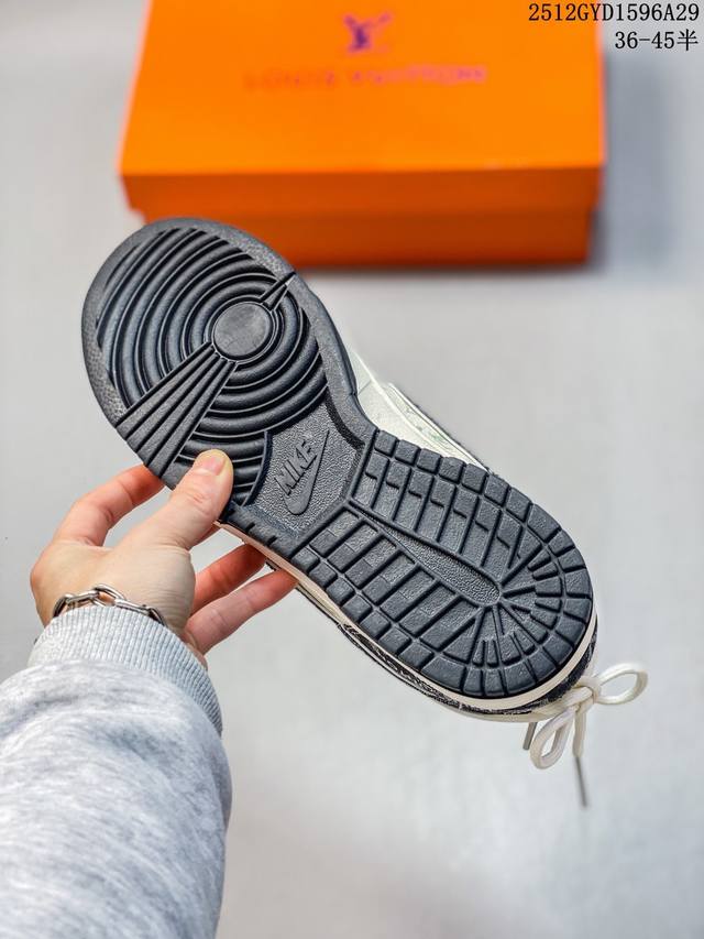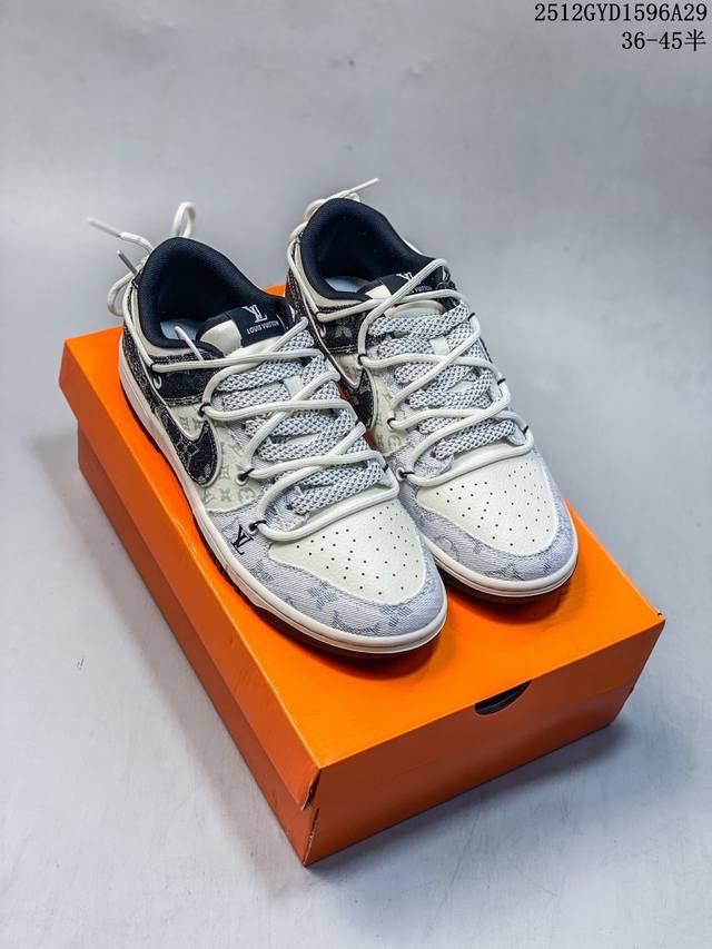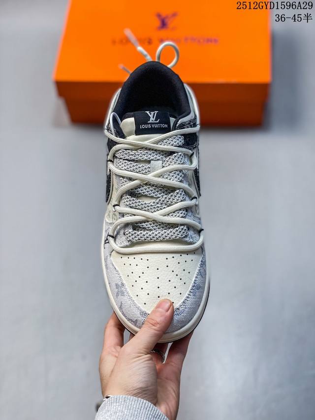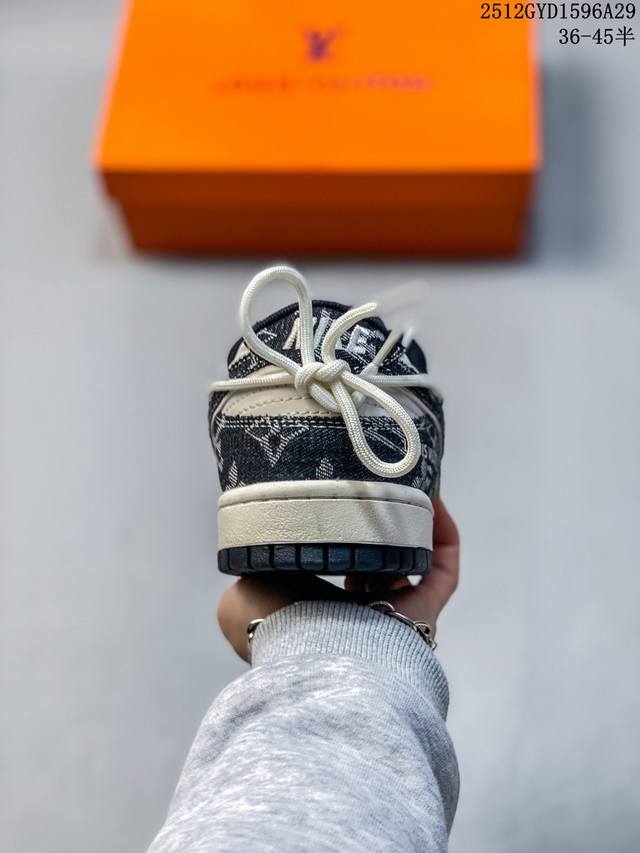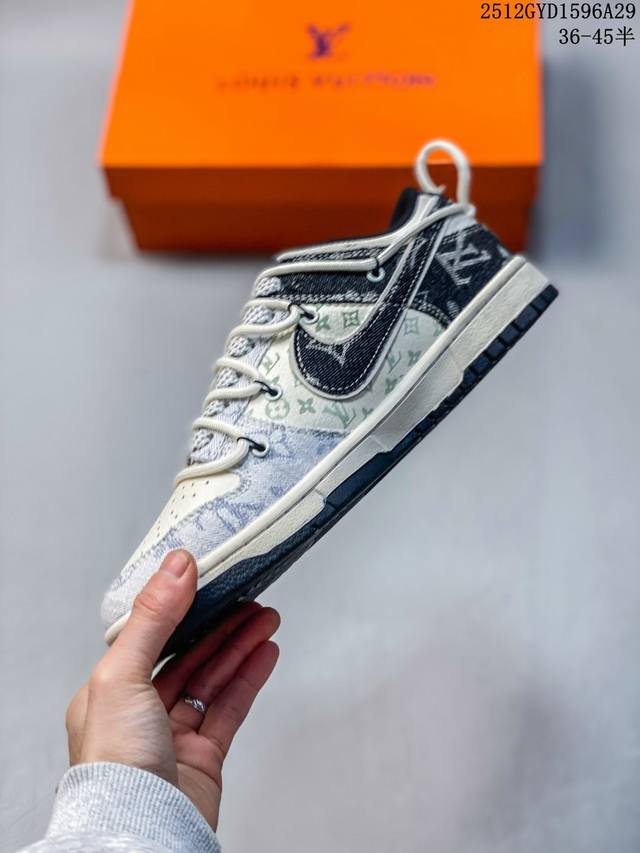 Denim Luxury, Low-Top New Flavor | Nike Dunk Low X Louis Vuitton Collaboration! When the retro streetwear soul of Nike Dunk Low meets the high-end denim aesthetics of Louis Vuitton, this Cx5050-Y43 collaboration becomes a stunning masterpiece of luxury streetwear crossover, creating a new spark by colliding the casualness of streetwear sneakers with the refinement of a haute couture brand. The upper is made of black and white denim fabric as the core material, spliced with light-textured fabric printed with the classic LV Monogram monogram. The rough texture of denim and the luxurious pattern of the monogram intertwine, instantly creating a rich visual tension. The deconstructed design of the black denim Swoosh breaks the norm, and the "Louis Vuitton" logo on the side of the shoe echoes the LV embroidery on the toe. Details such as woven shoelaces and metal eyelets are embellished, and every detail reveals the ingenuity of the collaboration between the two brands, giving the classic Dunk Low silhouette a new look of luxury streetwear. The Nike Dunk Low X Louis Vuitton features a beige midsole and a black outsole, maintaining the iconic retro feel and versatility of the Dunk Low. This collaboration, blending denim and classic monogram, is suitable for both casual streetwear and sophisticated high-street looks. Whether a denim enthusiast's go-to collector's item or a streetwear staple for trendsetters, the Nike Dunk Low X Louis Vuitton exudes a unique denim-chic charm, making you the center of attention on your feet. Sizes: 36 36.5 37.5 38 38.5 39 40 40.5 41 42 42.5 43 44 44.5 45 (Ddd 12Gyd1596A29)
