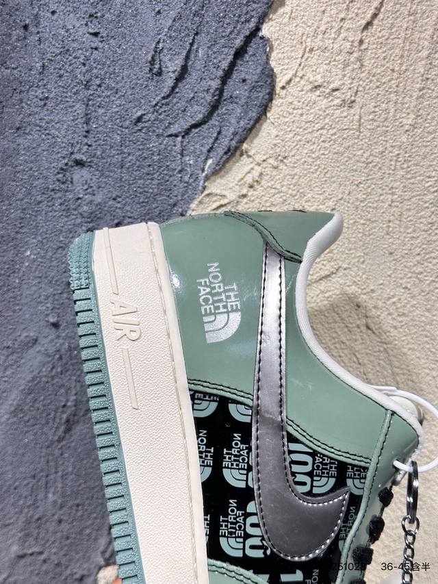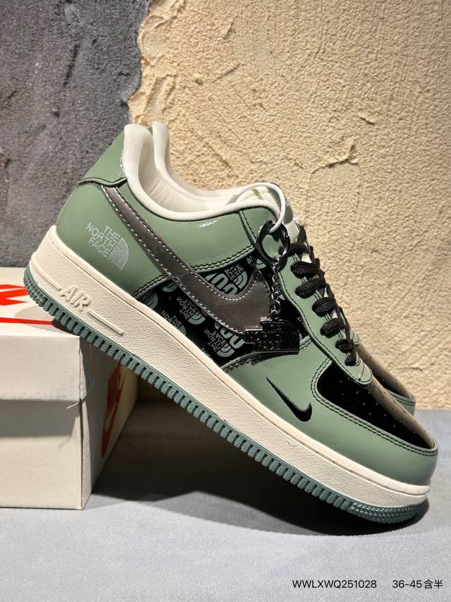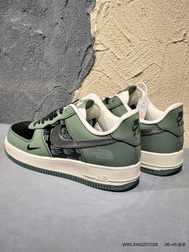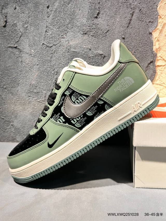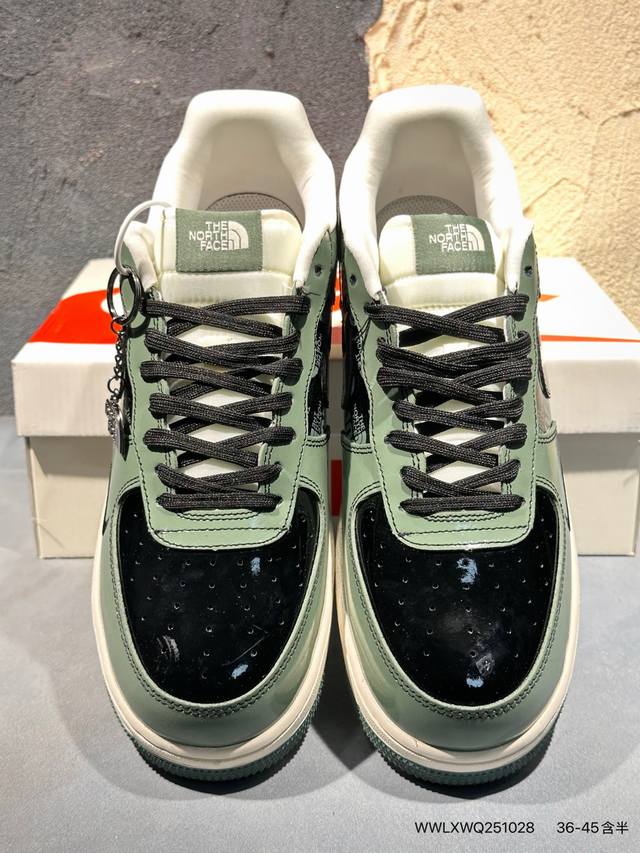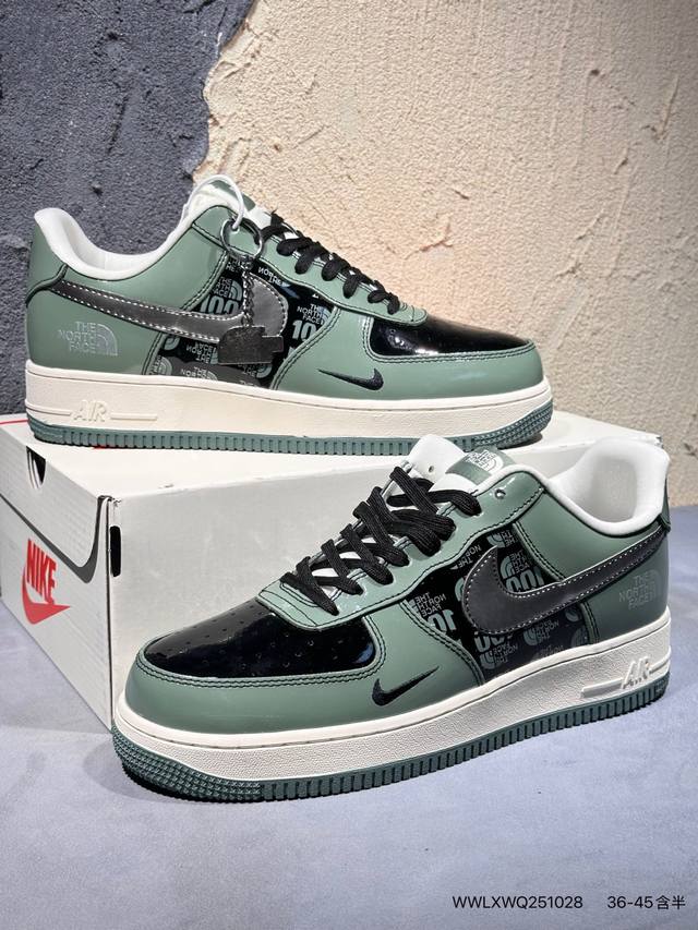 Limited release of an overseas hot item! High-end custom Nike Air Force 1 '07 Low "The North Face Collaboration---Military Green" features a retro military green patent leather upper, giving it a premium feel and high recognizability; it has a strong visual impact and attracts attention with every step; the midsole continues the classic PU cushioning structure of the Air Force 1, using a one-piece molding process with precisely adjusted density to balance cushioning and support. The outsole is a combination of rubber and green trim. These high-end custom low-top casual sneakers come in a custom shoebox from a large factory, ensuring pure original quality. The leather is cleanly cut with no rough edges, and the details are perfect. Product No.: Df0188-100. Sizes : 36, 36.5, 37.5, 38, 38.5, 39, 40, 40.5, 41, 42, 42.5, 43, 44, 44.5, 45. (Wwlxwq251028)