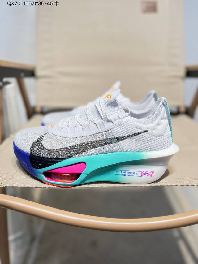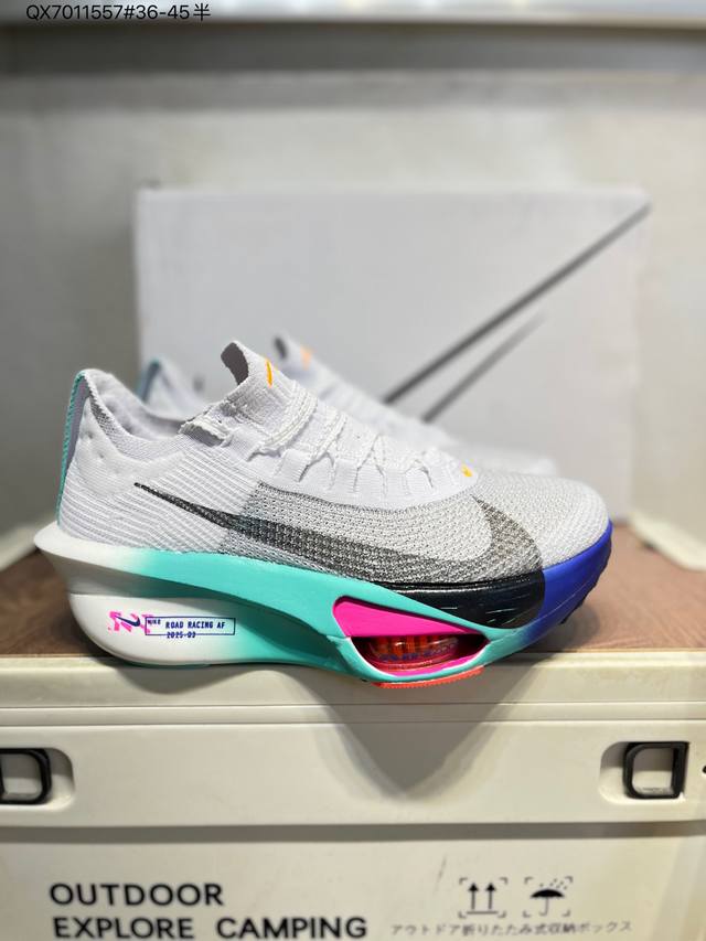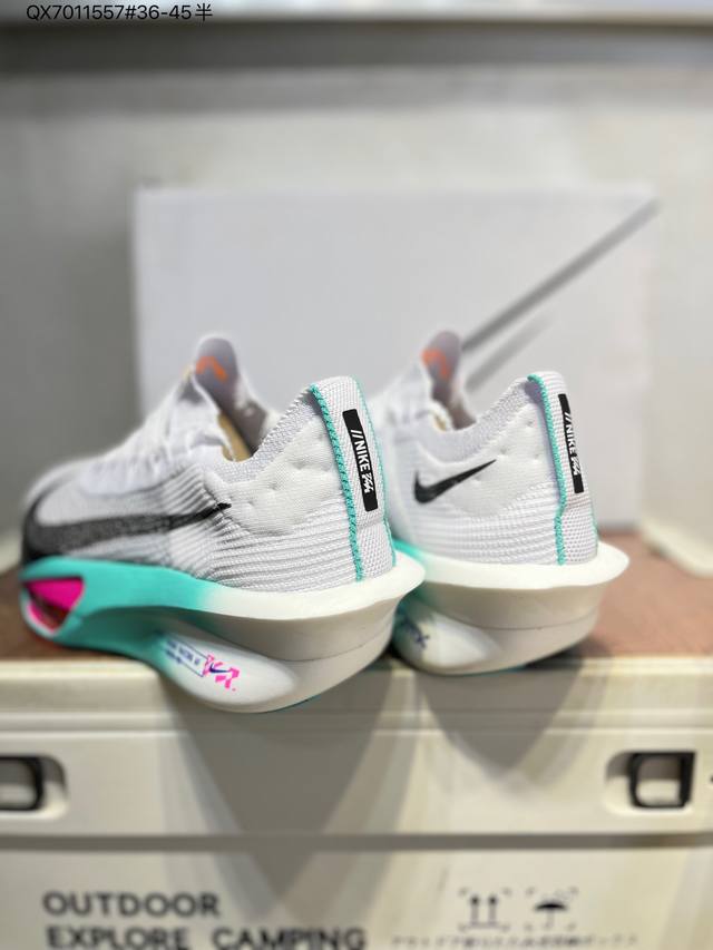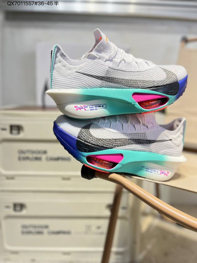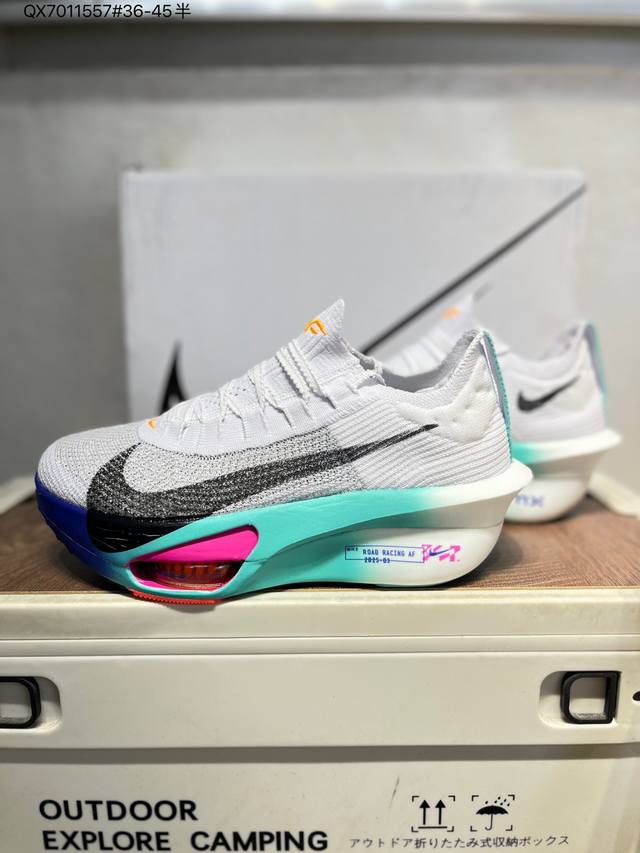 Nike Air Zoom Alphafly Next% 3 Marathon Super Shoe. The lightest and most tested Nike Alphafly ever, tested and validated by elite marathon runners and featuring Air Zoom cushioning, designed to help runners achieve breakthroughs and better results. During its development, Alphafly 3 helped Nike athlete Kelvin Kiptum break the marathon world record with a time of 0:35. The Alphafly's dynamic design remains unchanged, retaining the Air Zoom unit, Flyplate carbon fiber plate, and Zoomx foam. However, the overall system's construction method has been slightly adjusted, optimized, and improved to enhance its support for athletes. Key updates include a one-piece sole providing a smooth and stable "heel-to-toe" transition; a wider full-length Flyplate carbon fiber plate providing stable propulsion; a new Fast Shot outsole ensuring excellent traction and grip; and a new Atomknit 3.0 upper providing enhanced control, breathability, and midfoot support. (Fd8315) Qx7011557#36-45 half